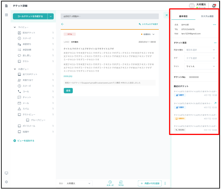 メールチケット詳細画面ではチケットの返信や顧客情報の変更、カスタム項目の編集のなどが行えます。
