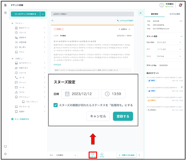チケット詳細画面下部からスヌーズ設定が可能です。
