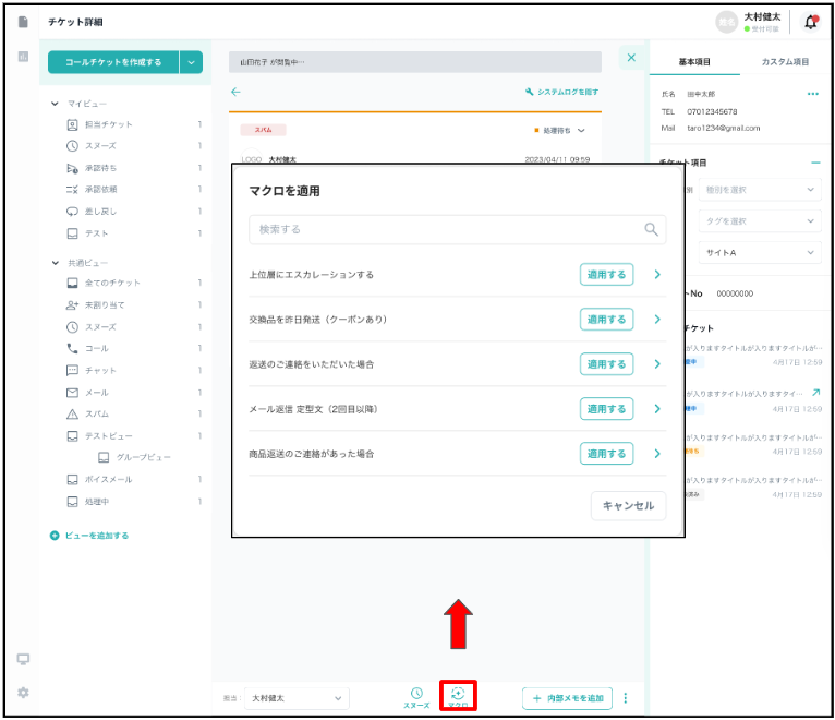 チケット詳細画面の右側の「基本項目」のタブから、顧客情報の編集やチケット項目の設定が行えます。
