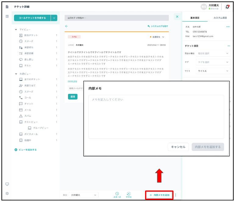 チケット詳細画面右下の「内部メモを追加」を選択して管理画面のみで表示されるメモを追加できます。