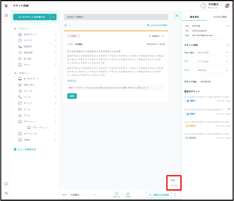 を選択してチケットをスパム設定、削除が行えます。