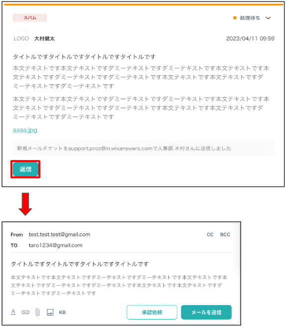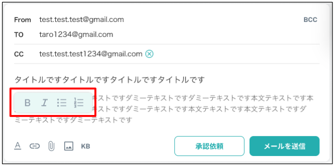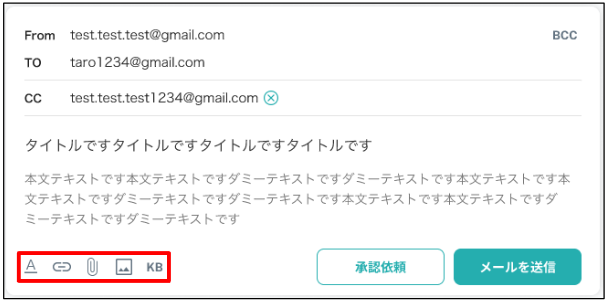 入力欄ではメールの返信や CC/BCCの追加、承認依頼などが行えます。