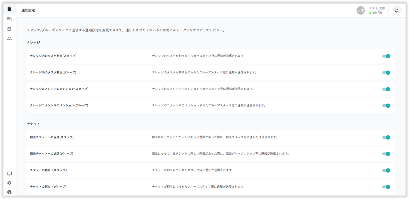 タスクやチケットが自分(またはグループ)に割り当てられた場合やコメントでメンションがあった場合などに受信する通知(アプリ内通知ならびにメール通知)のON/OFFを選択できるようになります。
