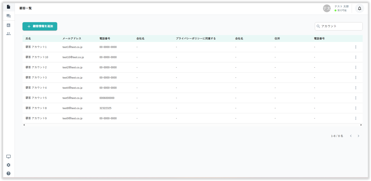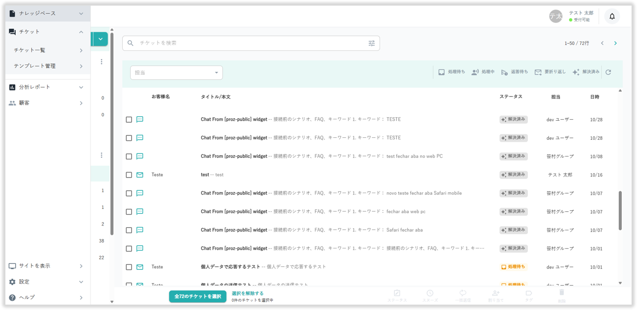顧客(エンドユーザー)のお名前、メールアドレス、電話番号の管理、検索が可能となります。こちらはチケット機能に付随する機能となり、ナレッジベース機能では利用されない機能となります。