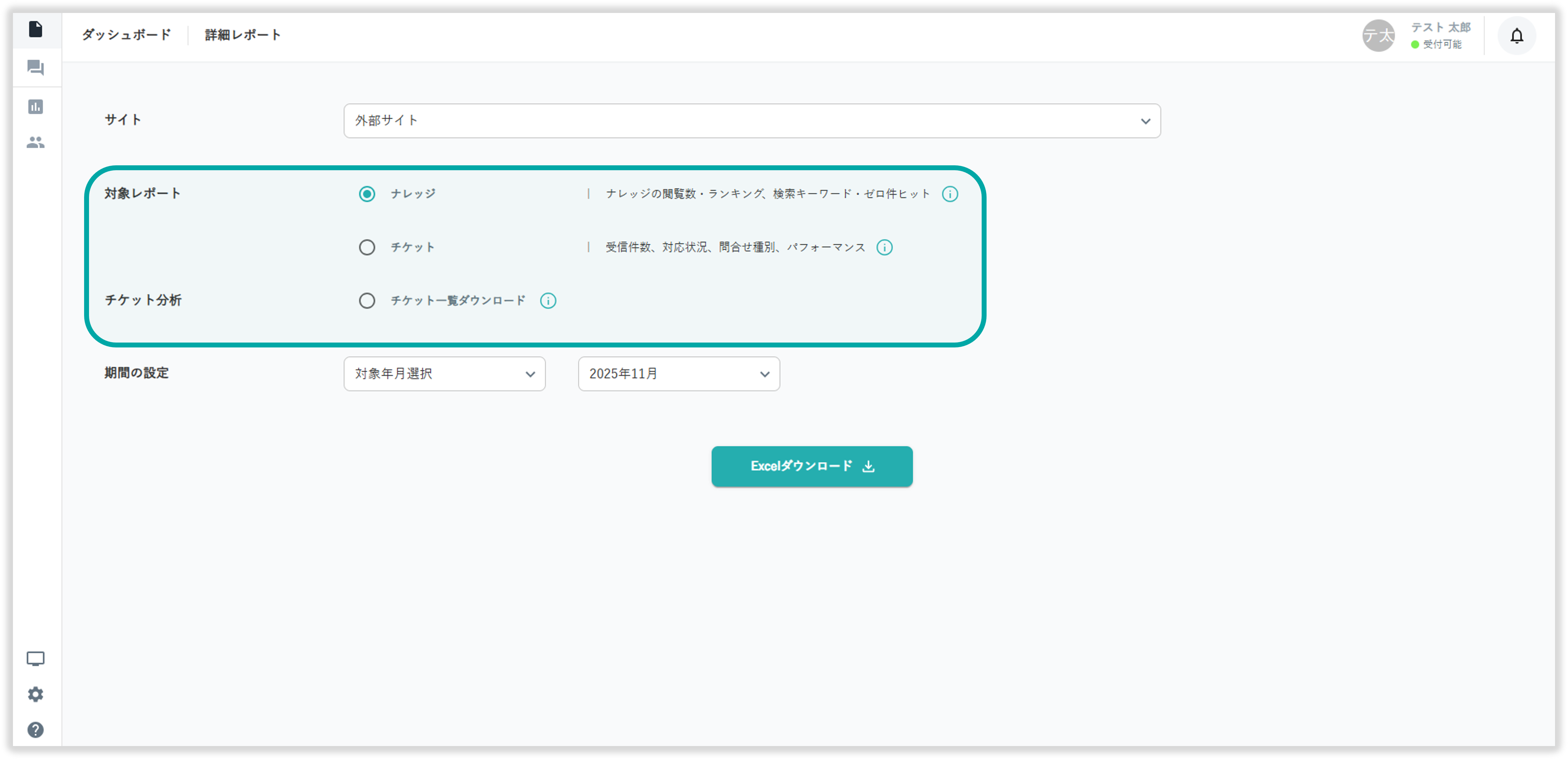 現在ある「ナレッジ」詳細レポートに加え、チケット機能向けに「チケット」ならびに「チケット一覧ダウンロード」が選択可能となります。