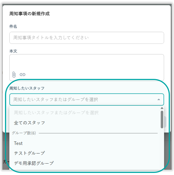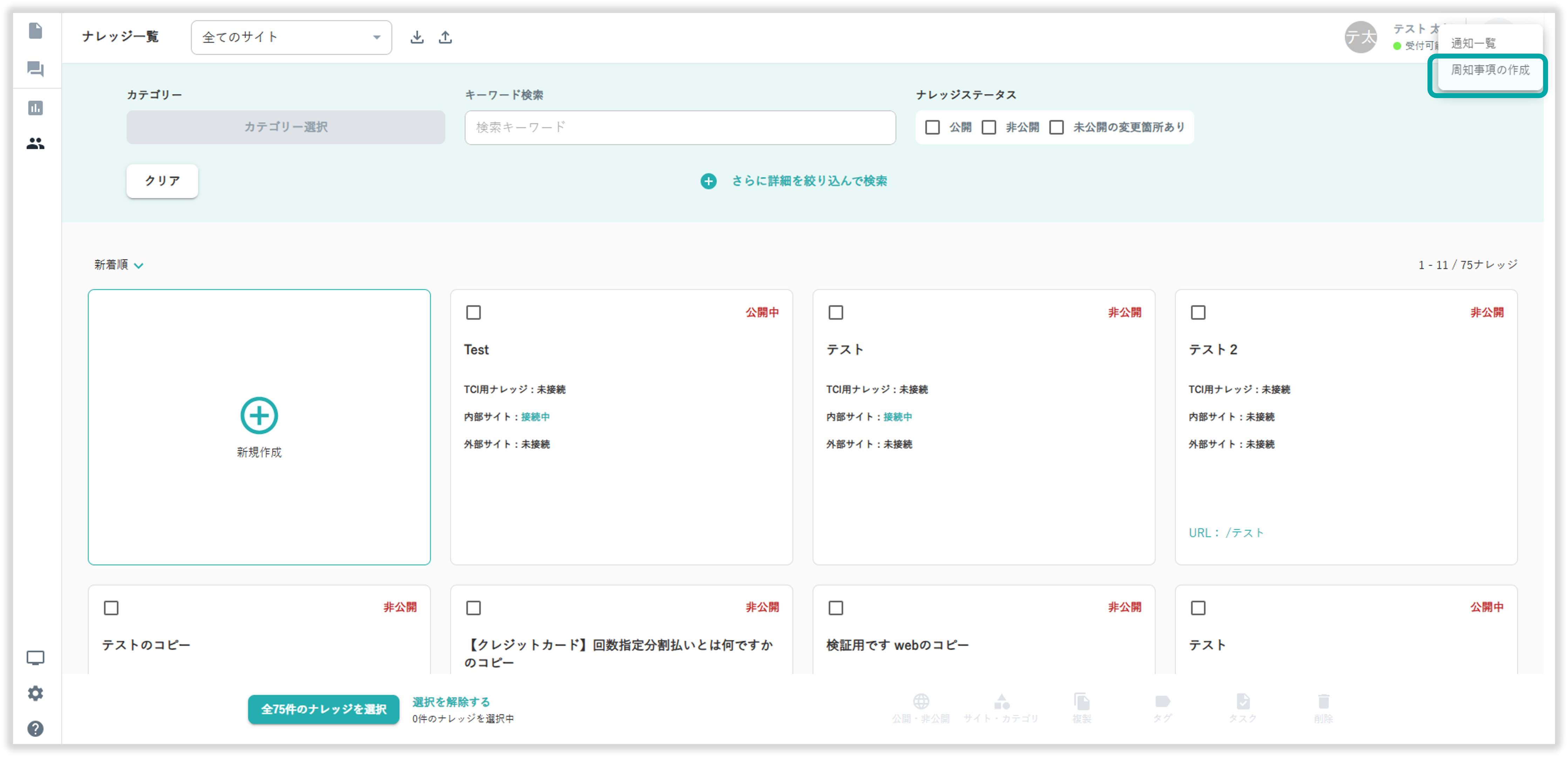 スタッフ(コールセンターのスタッフ等)向けに周知事項を作成、送信する機能が追加となりました。業務上の連絡や、勤怠、人事に関わるものなど、社内連絡をこの機能を活用し行っていただくことが可能となります。