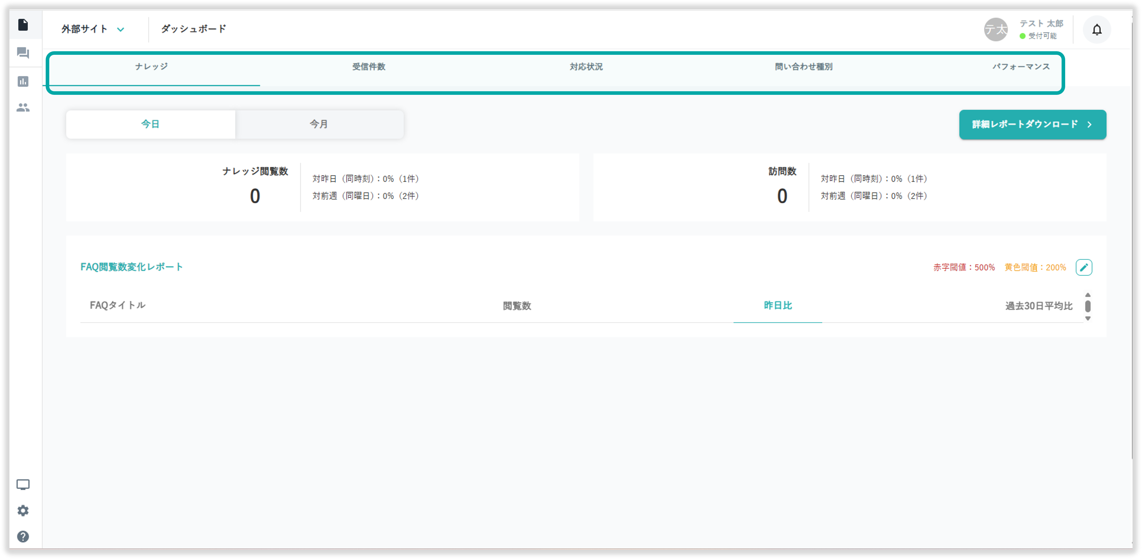 現在ある「ナレッジ」に加え、チケット機能向けに「受信件数」「対応件数」「問い合わせ種別」「パフォーマンス」のタブが追加されます。
