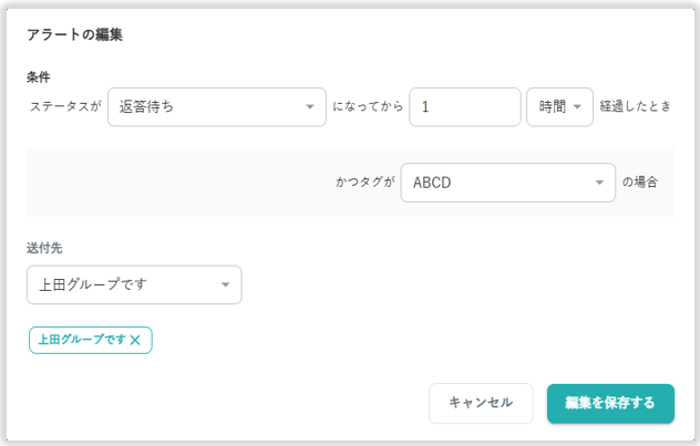 条件チケットステータスと経過日数/時間を条件として選択できます。またラベルを条件にできます。送付先チケットが条件を満たしたときにアプリ内通知を送信するグループまたはスタッフを選択できます。