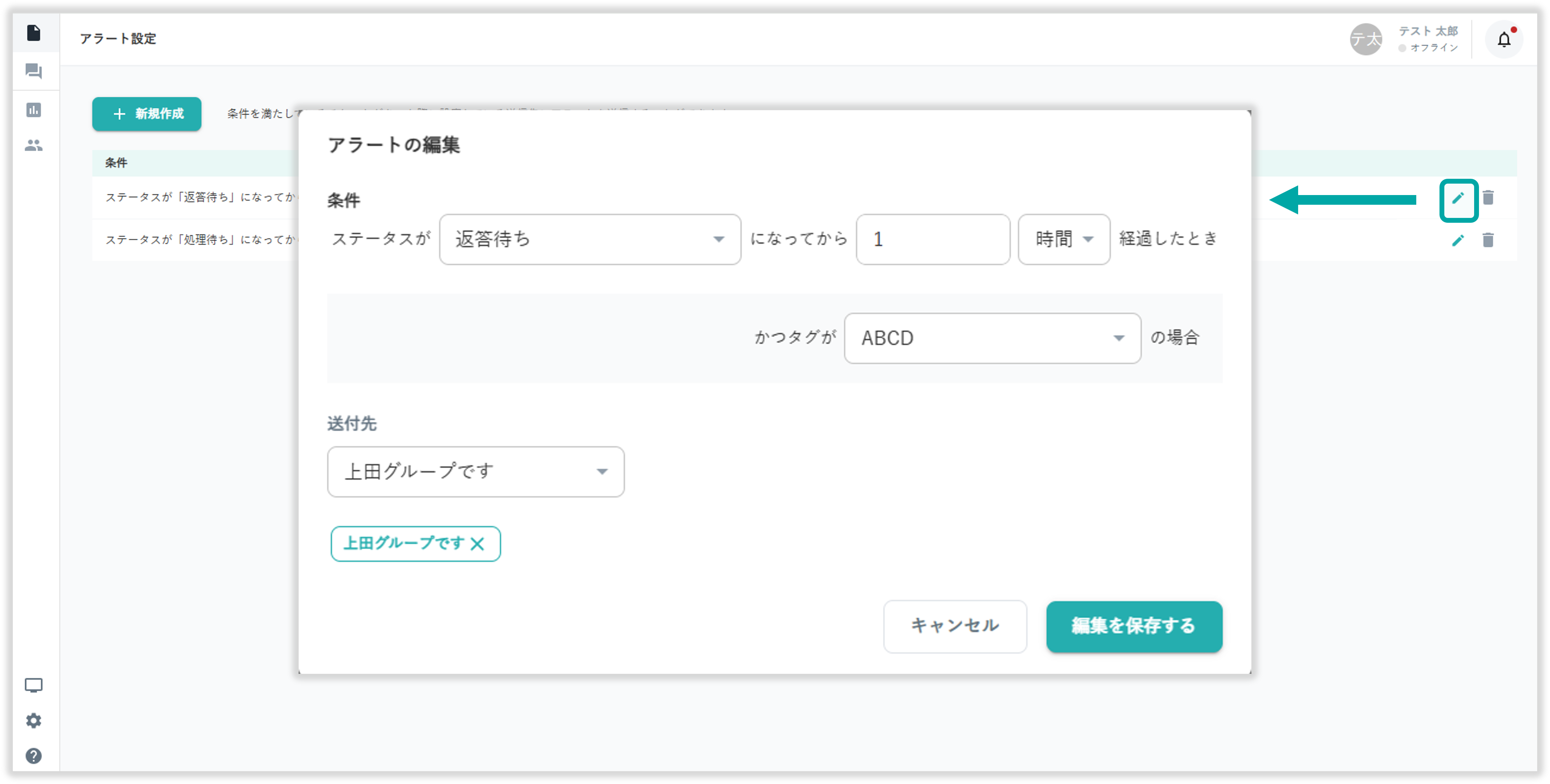 アラート一覧右側のアイコンを選択することでアラートの編集が行えます。
