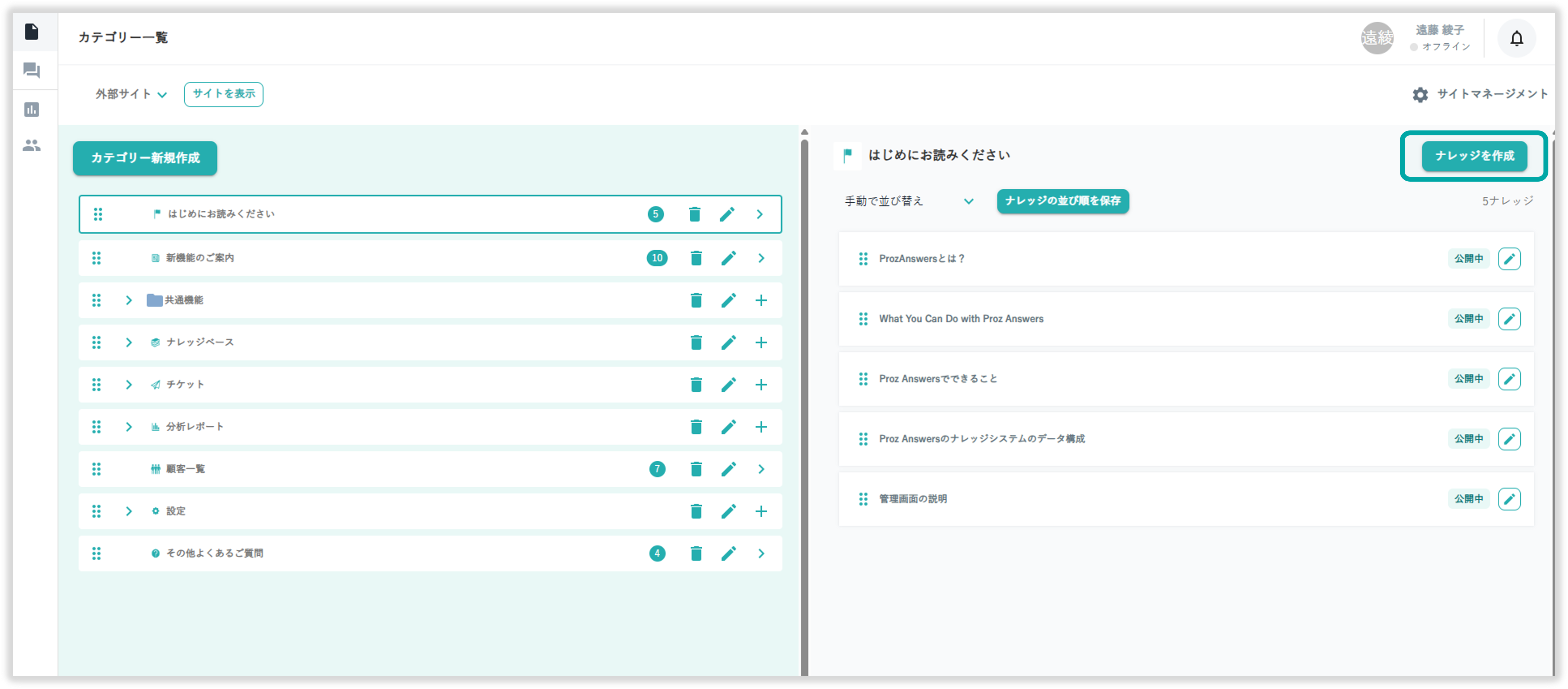 以下の手順でカテゴリー一覧から新規ナレッジを作成できます。