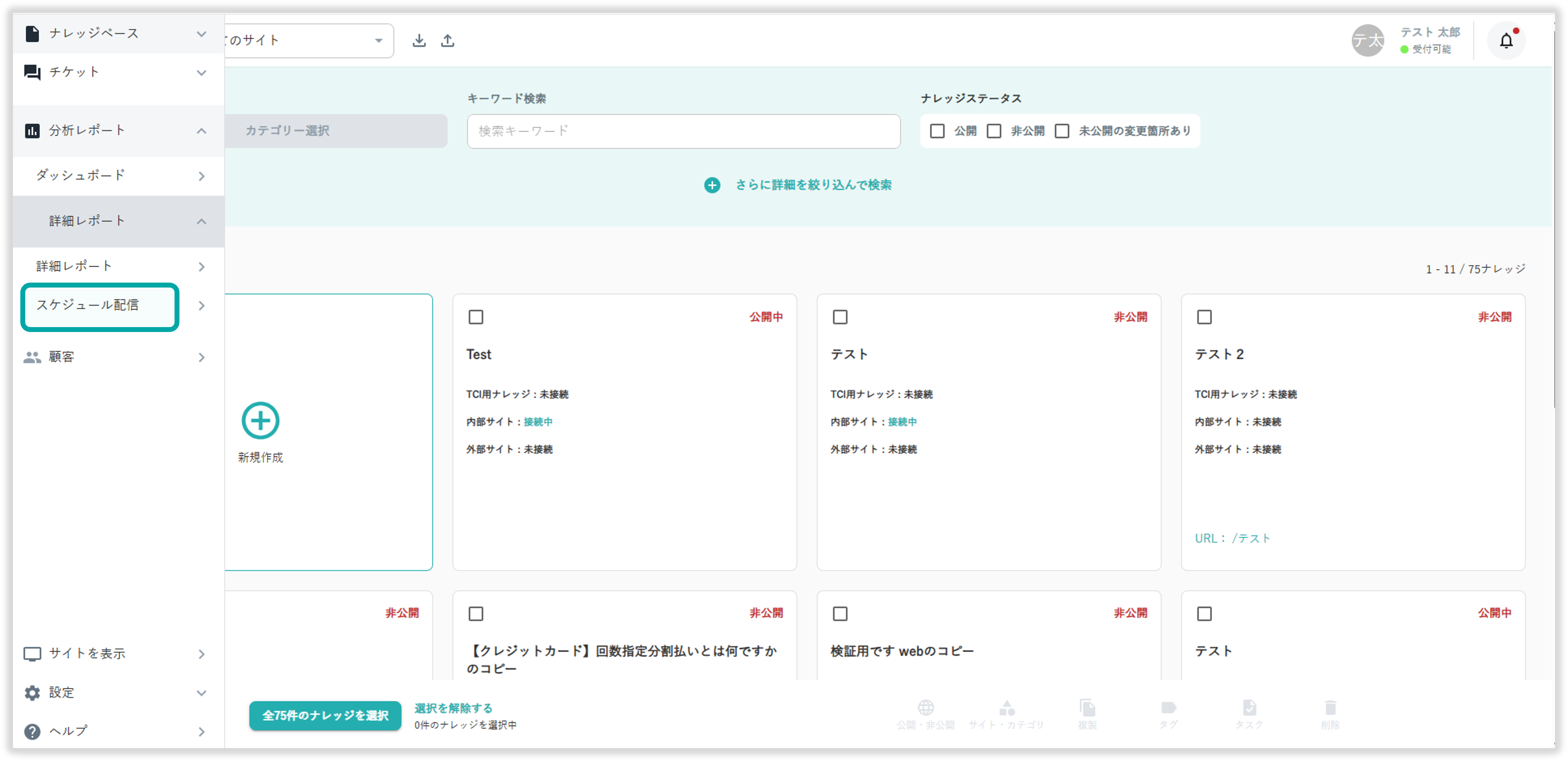 画面左上の 分析レポート>詳細レポート>スケジュール配信 を選択することでスケジュール配信画面へ遷移できます。
