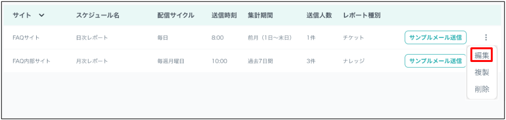 スケジュール配信一覧右側の3点リーダーから「編集」を選択することでスケジュール配信の編集が行えます。