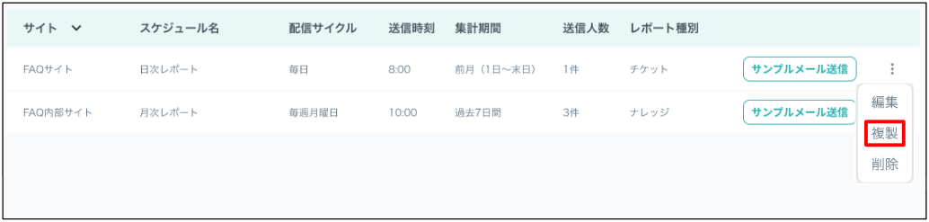 スケジュール配信一覧右側の3点リーダーから「複製」を選択することでスケジュール配信の複製が行えます。