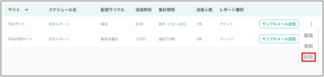 スケジュール配信一覧右側の3点リーダーから「削除」を選択することでスケジュール配信の削除が行えます。