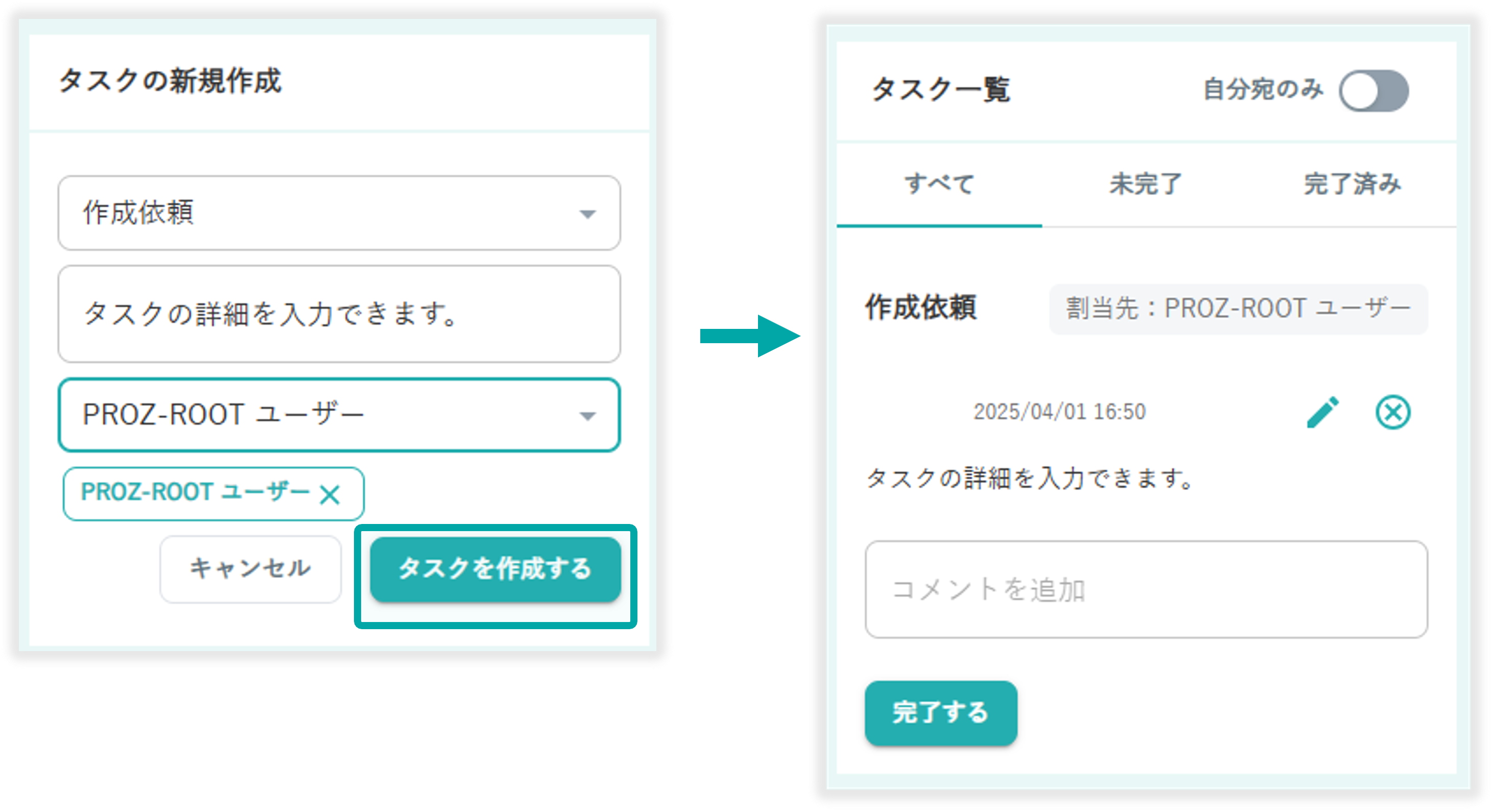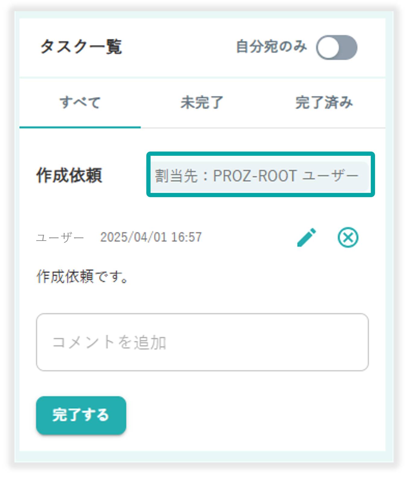 完了したタスクはタスク一覧の「完了する」を選択することで、タスク作成者とタスクを割り当てられたスタッフにタスク完了の通知が送信されます。