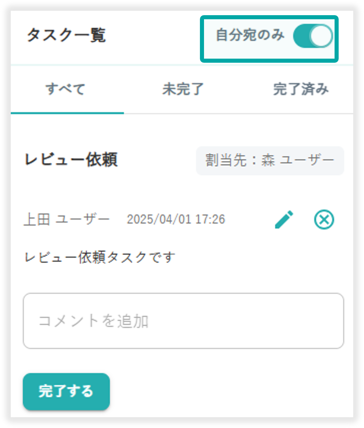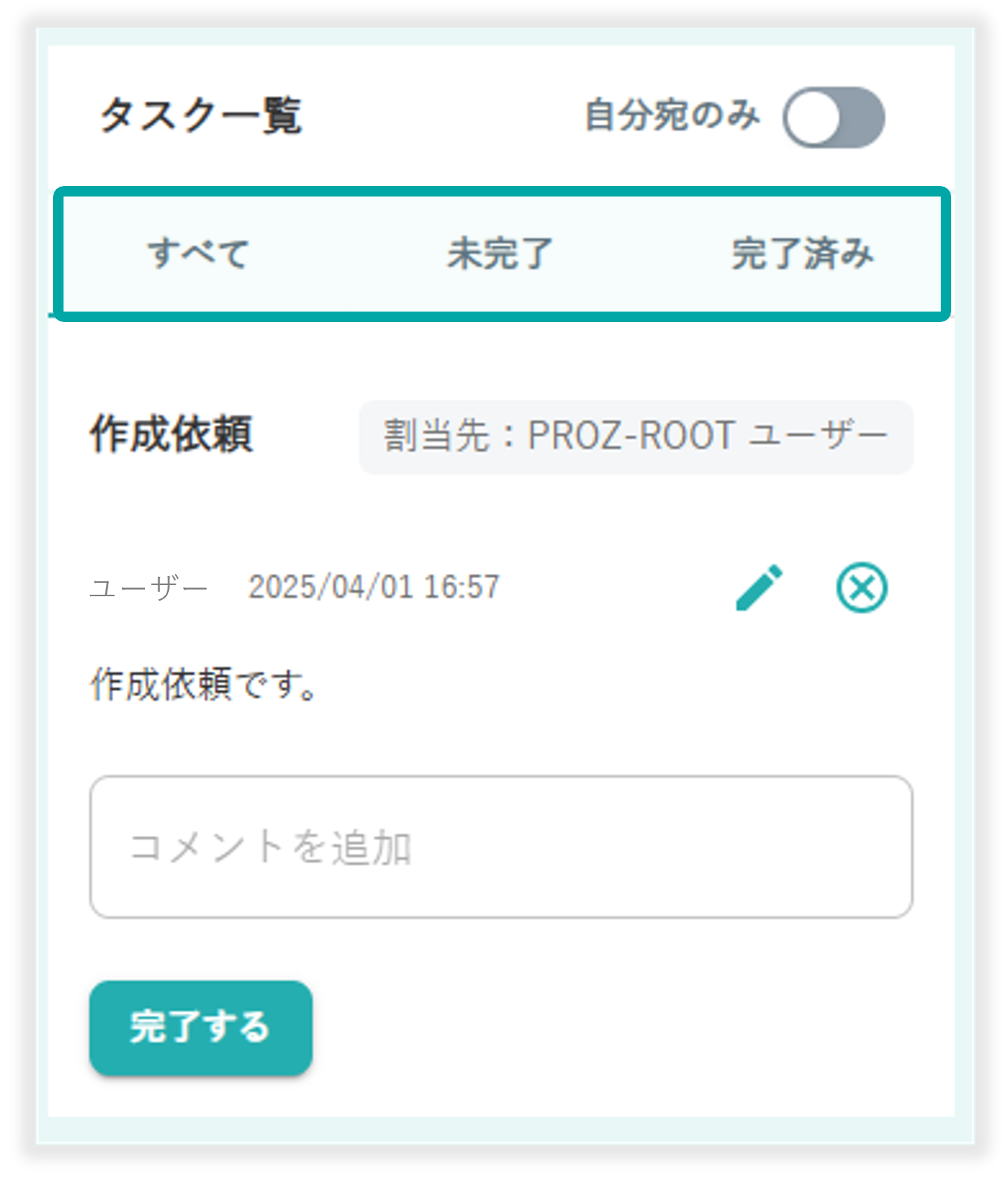 タスク一覧は「すべて」「未完了」「完了済み」を選択することで、タスクにフィルターをかけることができます。