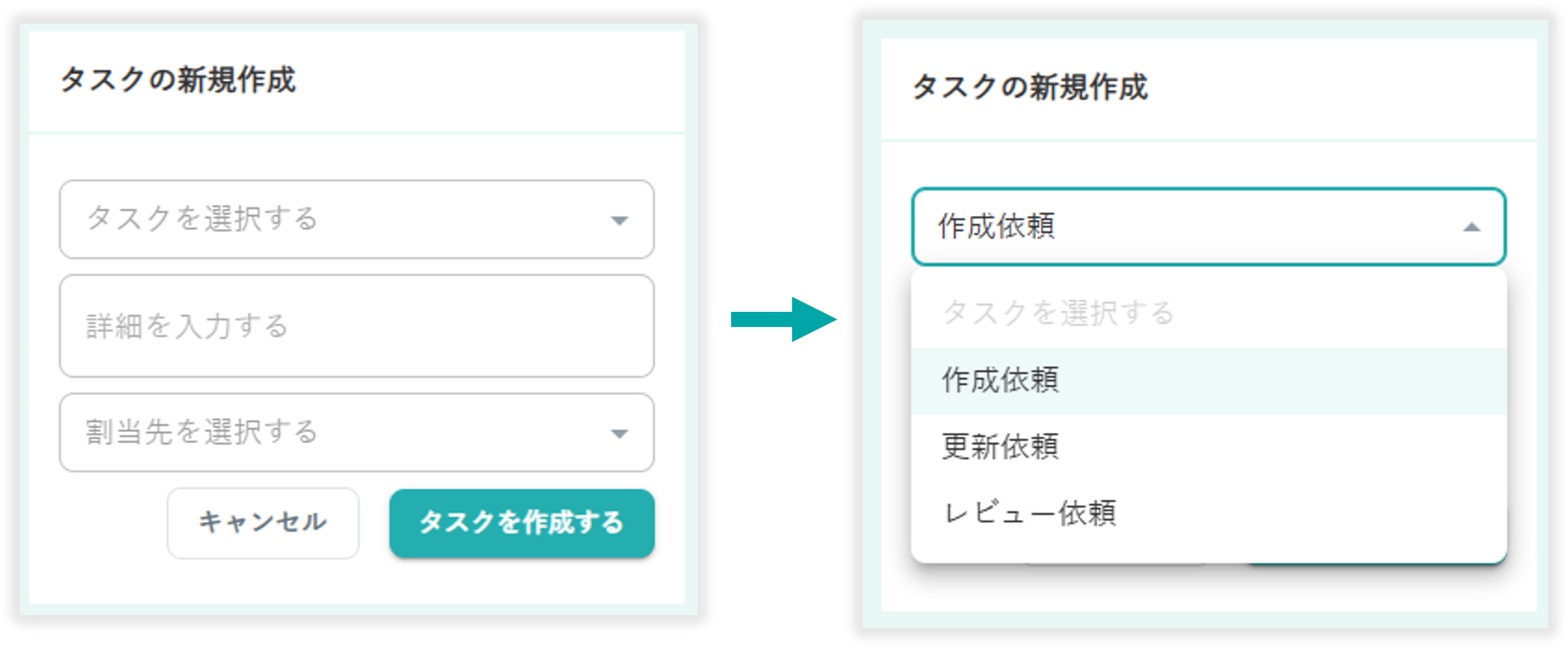 4. タスク作成の際は「作成依頼」「更新依頼」「レビュー依頼」からタスクの種類を選択してください。