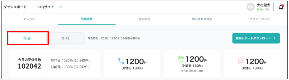 受信件数ダッシュボード上部の「今日」を選択すると、チケットの総受信件数と対昨日比、対前週比または、チャネル別件数と対昨日比を確認することができます。