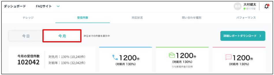受信件数ダッシュボード上部の「今月」を選択すると、チケットの総受信件数と対先月比、対前年比または、チャネル別件数と対先月比を確認することができます。