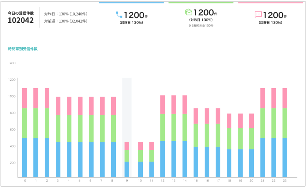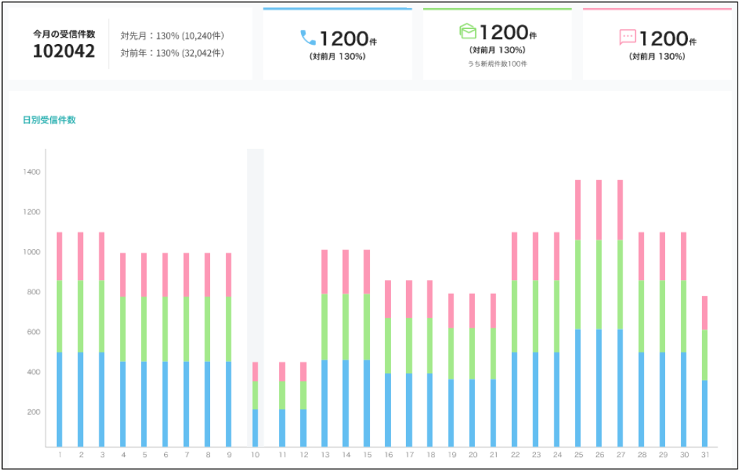送受信件数、チャネル別受信件数などの主要KPIの確認