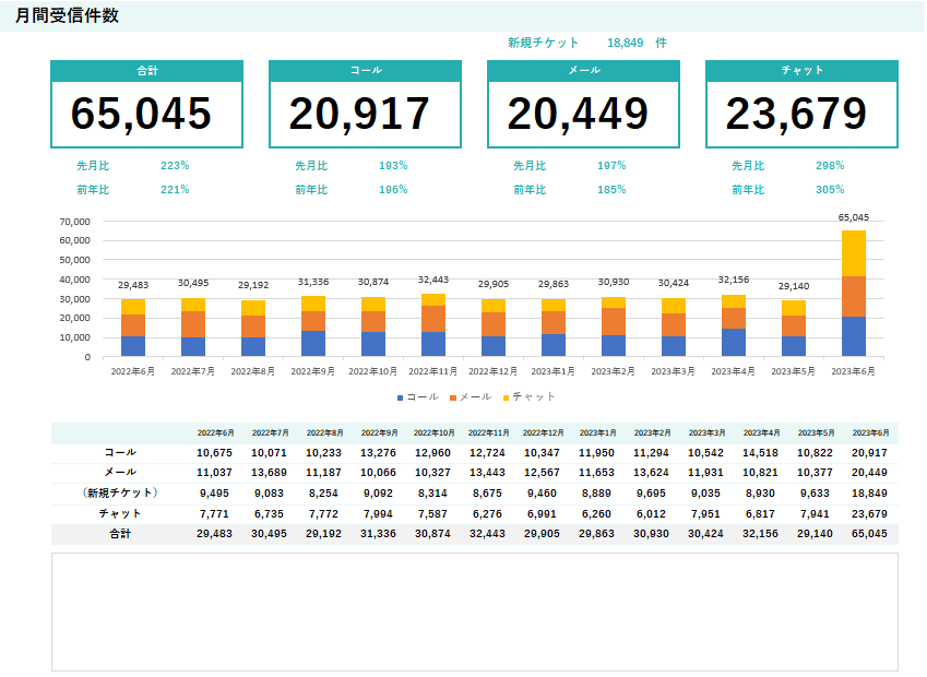 受信件数ダッシュボード上部の「今月」を選択すると、チケットの総受信件数と対先月比、対前年比または、チャネル別件数と対先月比を確認することができます。