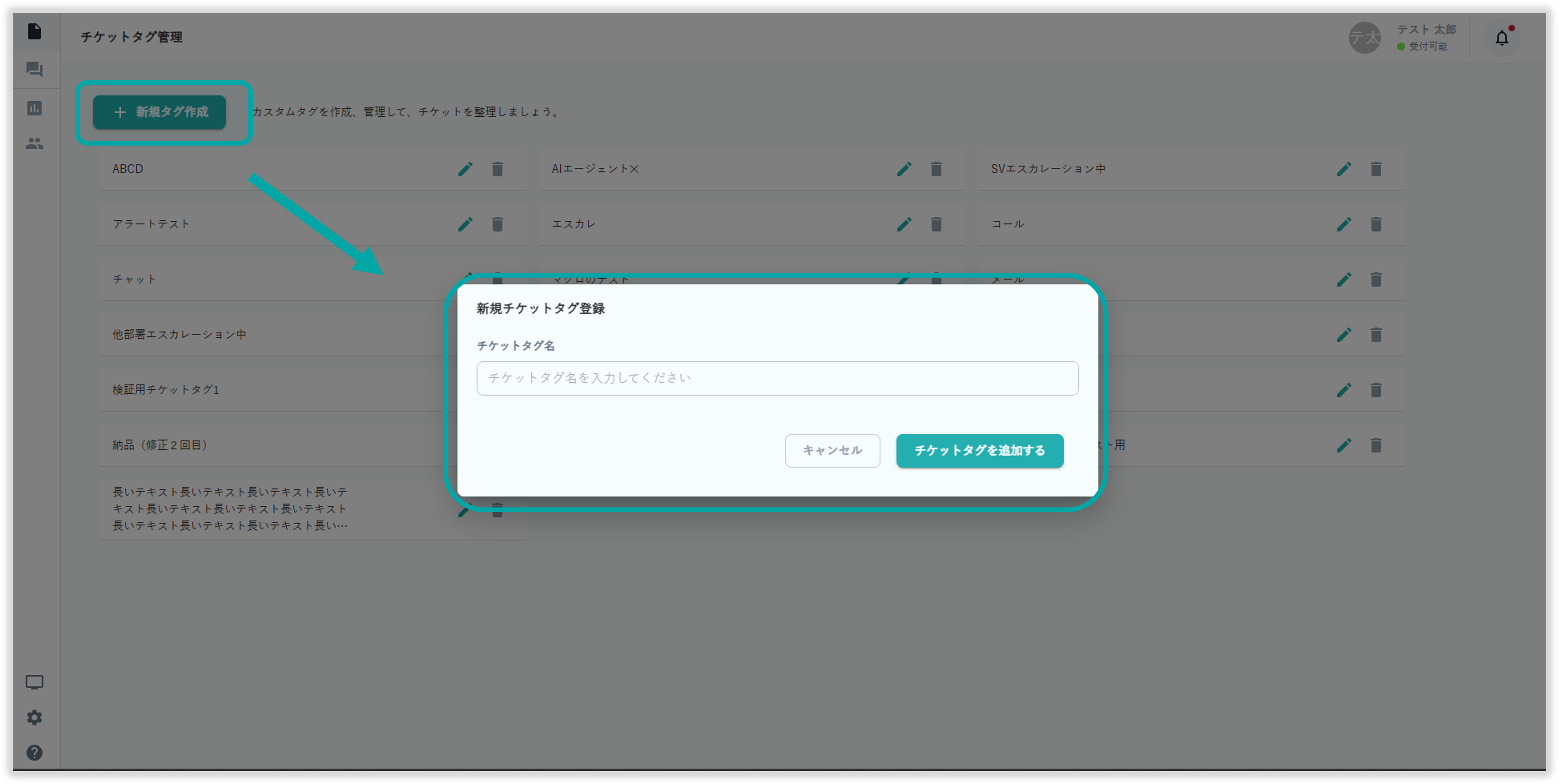 チケットタグ管理画面左上の「新規タグ作成」を選択してチケットタグの新規作成が行えます。