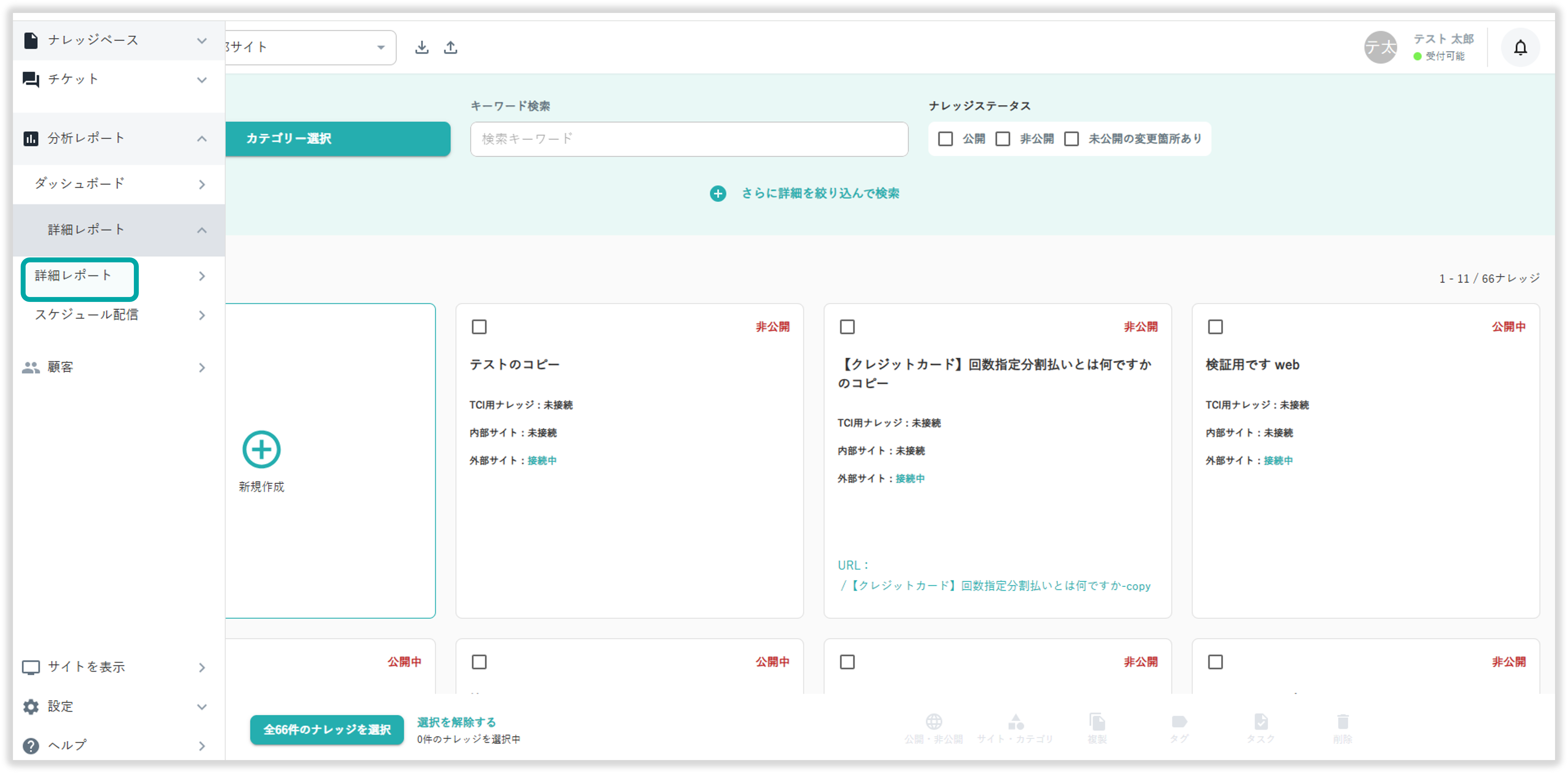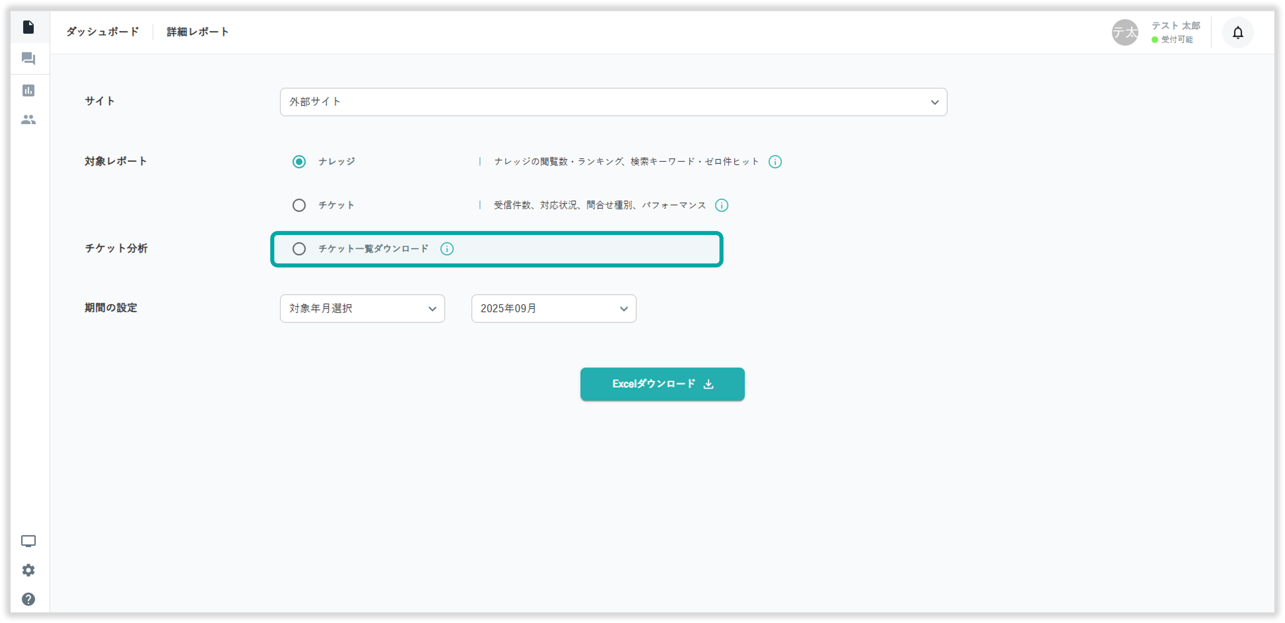画面左上の 分析レポート>詳細レポート>詳細レポート を選択してレポートダウンロード画面に遷移してください。