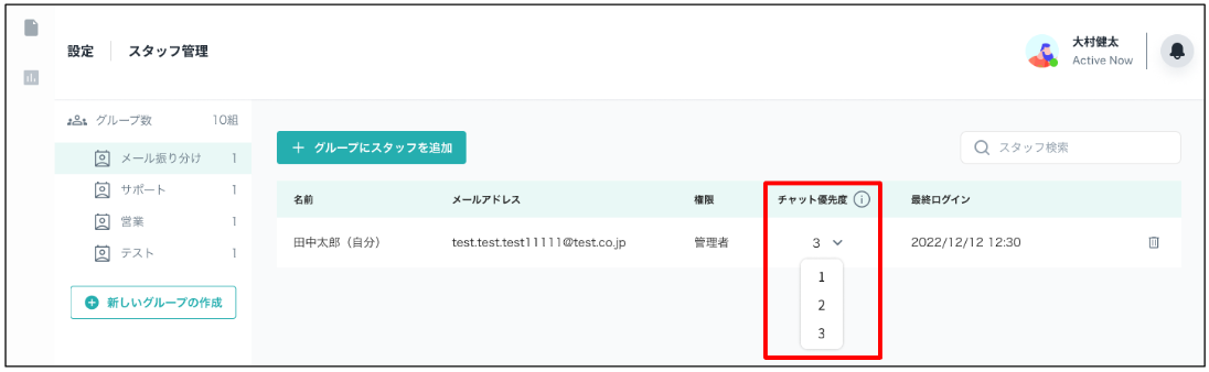 スタッフ管理画面からチャット優先度の変更が行えます。