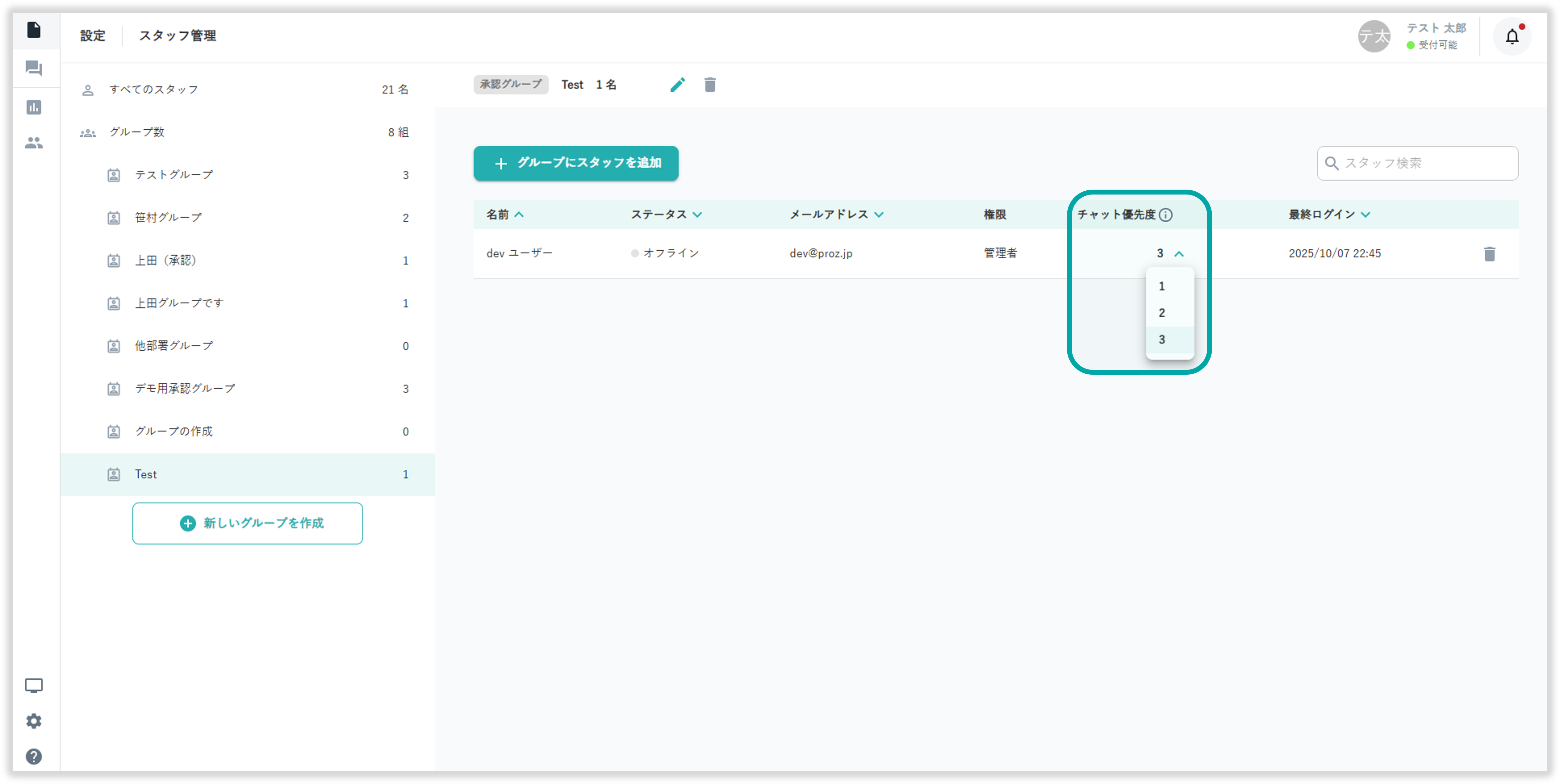 スタッフ管理画面からチャット優先度の変更が行えます。