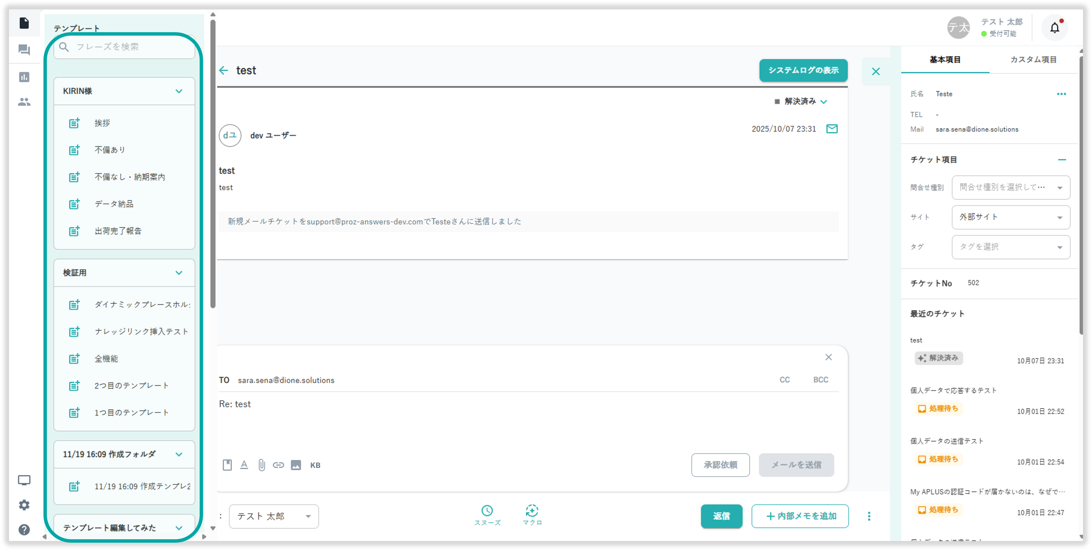 チケット詳細画面の左からテンプレートの挿入が可能です。