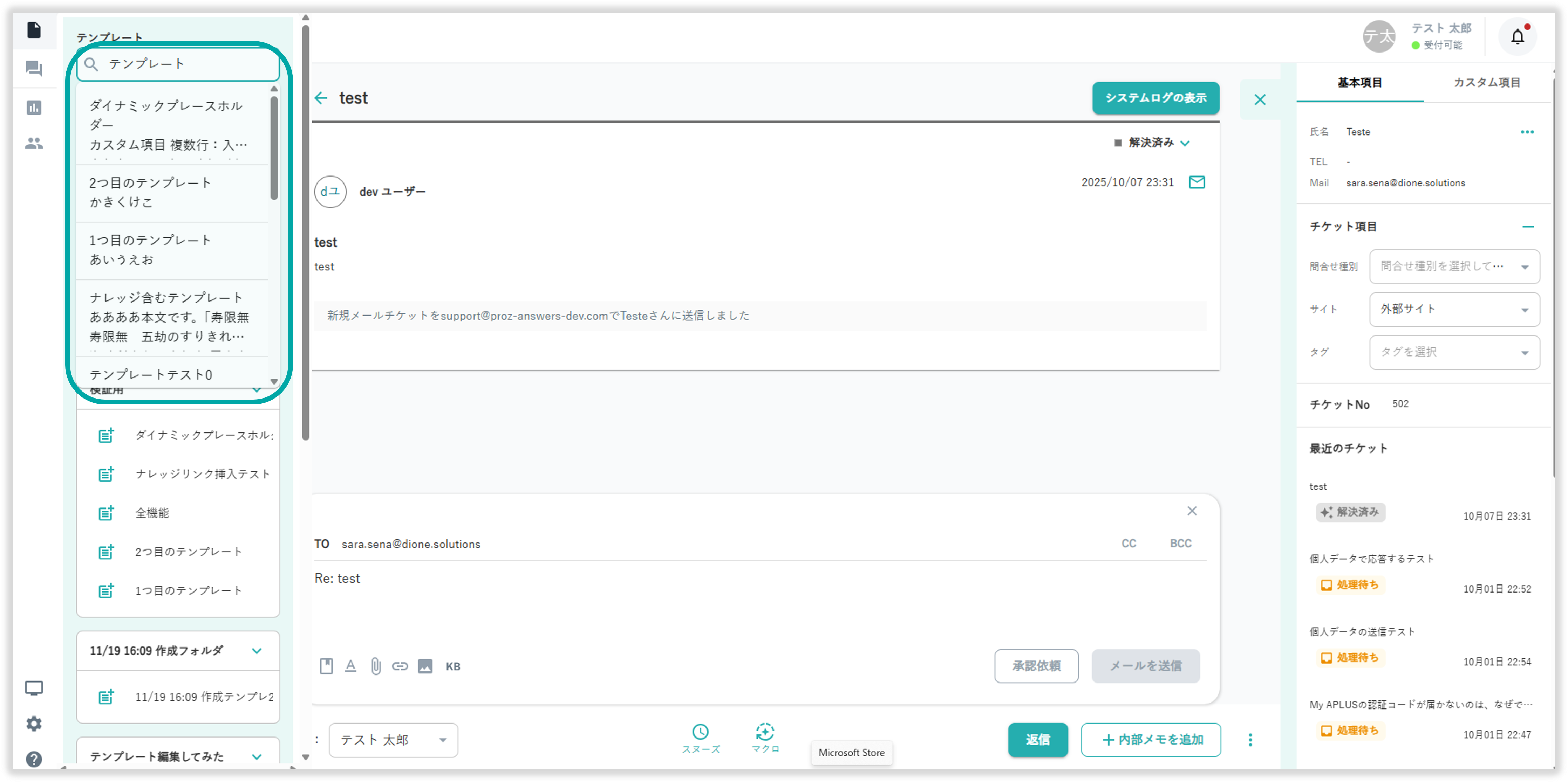 チケット詳細画面の左から作成したテンプレートの検索が可能です。
