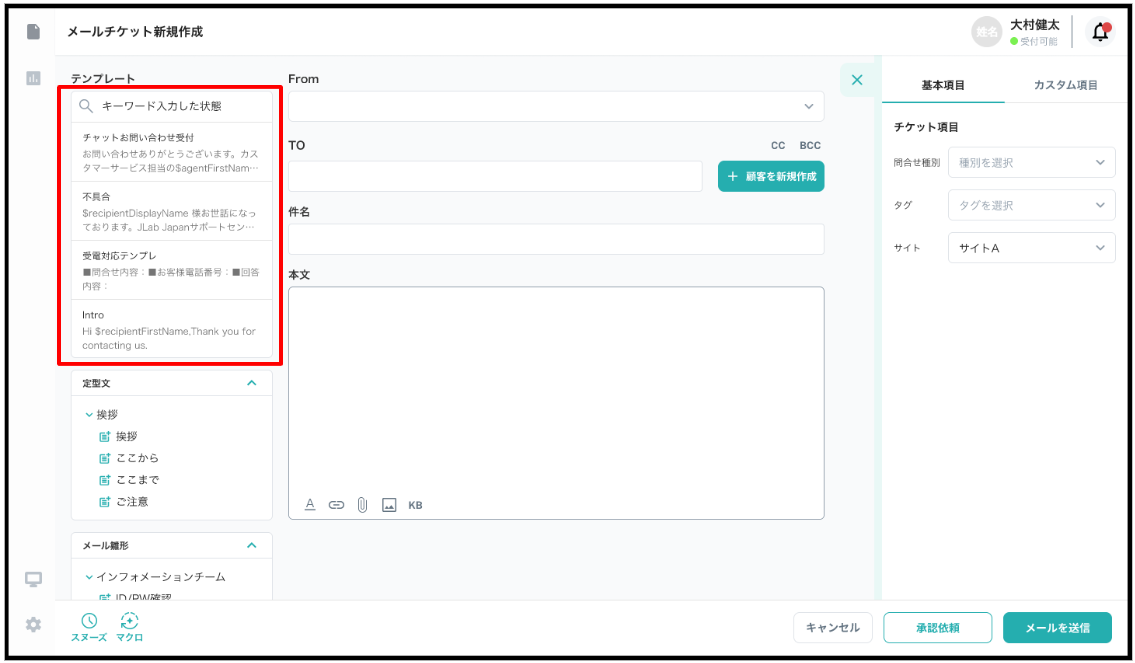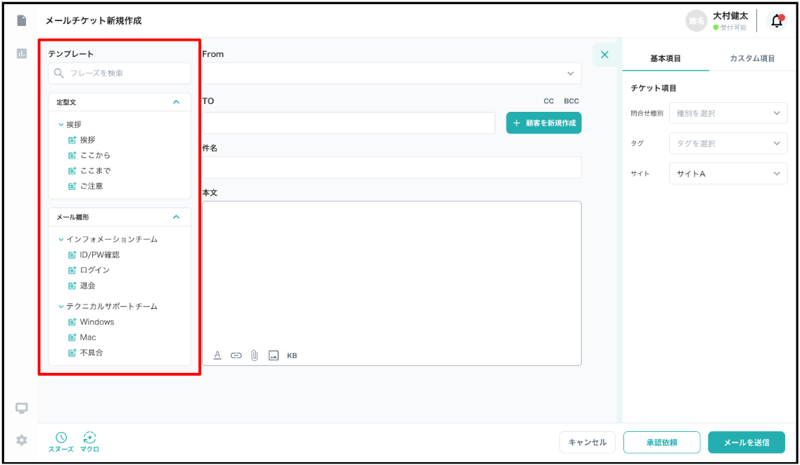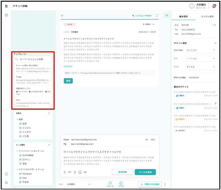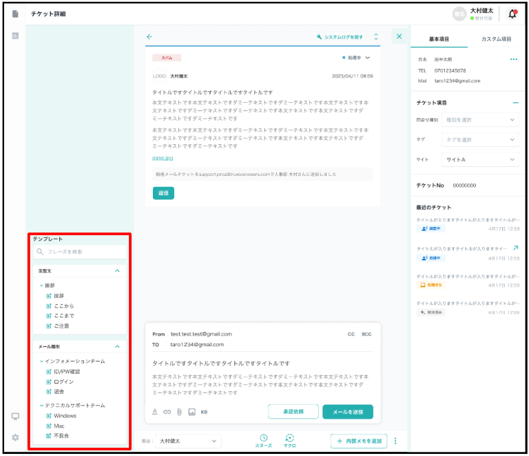 メール/コール チケット新規作成画面の左側からテンプレートの挿入が可能です。