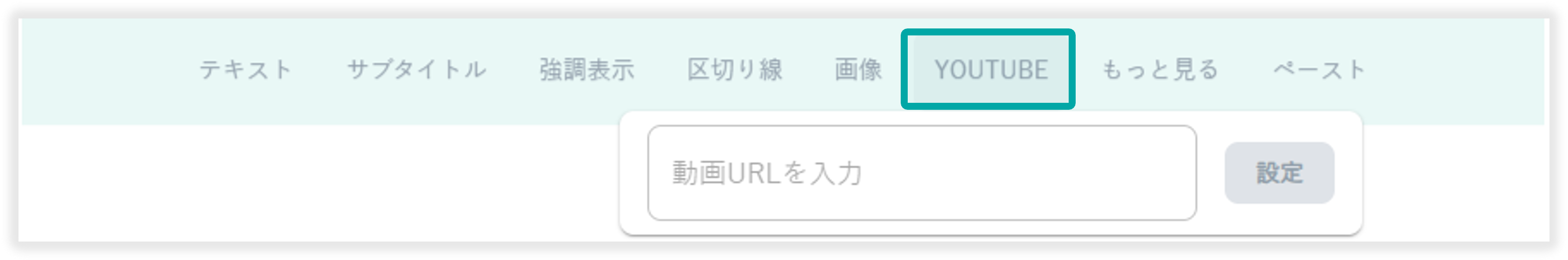 「YOUTUBE」を選択することで、YouTube動画の挿入が可能です。挿入にはURLを入力する必要があります。