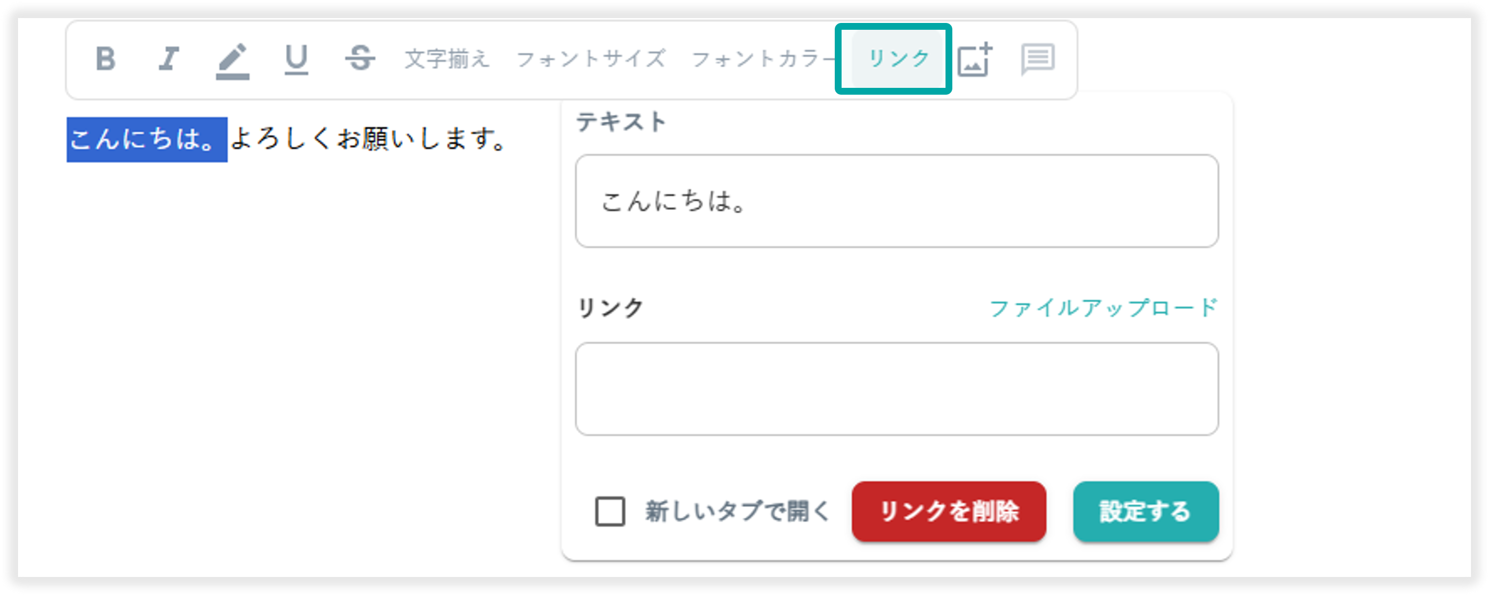範囲選択したテキストが表示されます。入力欄からリンクを挿入するテキストの編集が行えます。