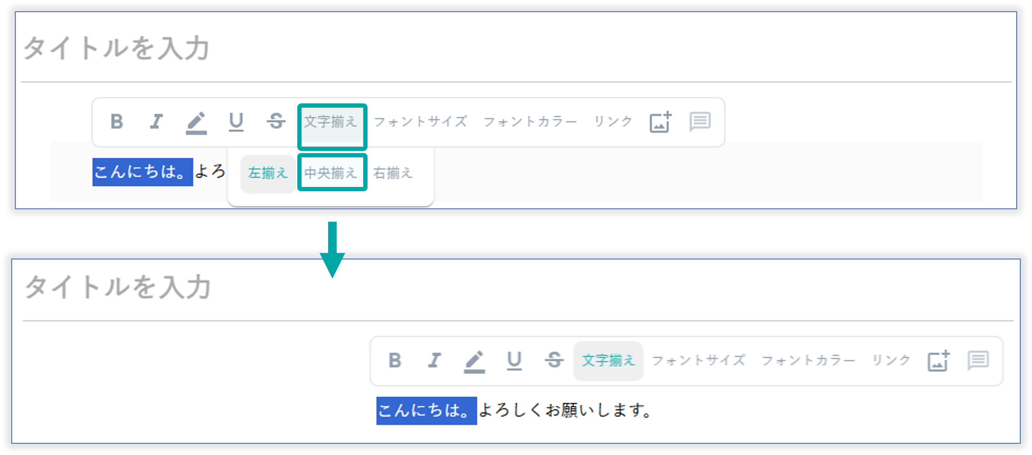 ※文字揃えは選択したテキストではなく、選択したテキストブロックに反映されます。