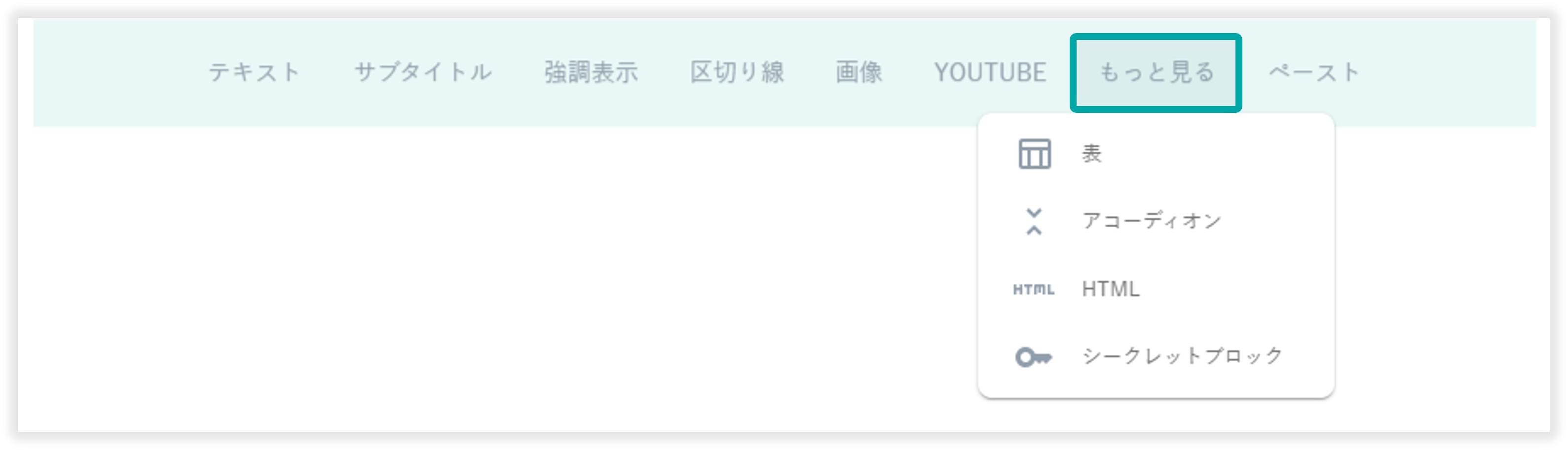 「もっと見る」を選択することで、以下の項目を挿入可能です。