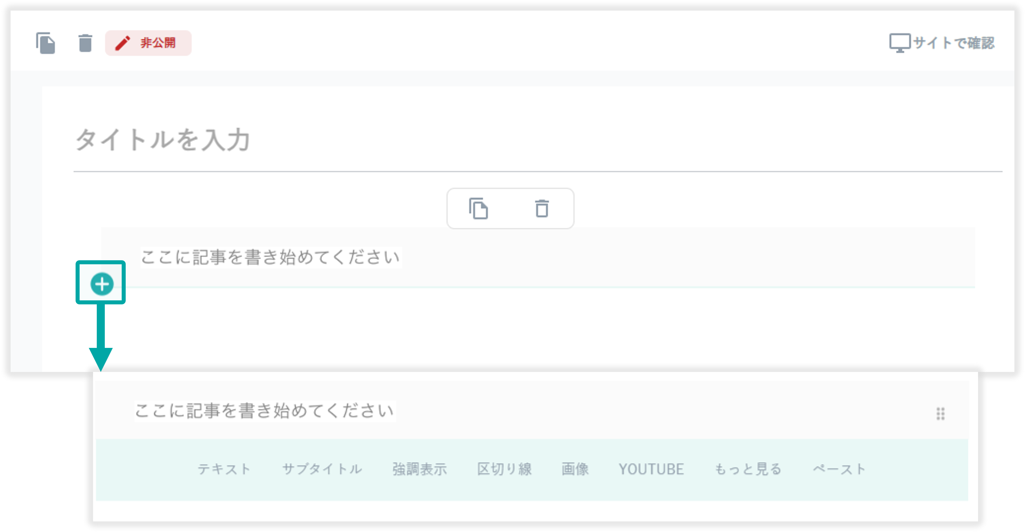 ブロックを削除する場合は、任意のブロックにカーソルを合わせると表示されるアイコンを選択することでコピー可能です。