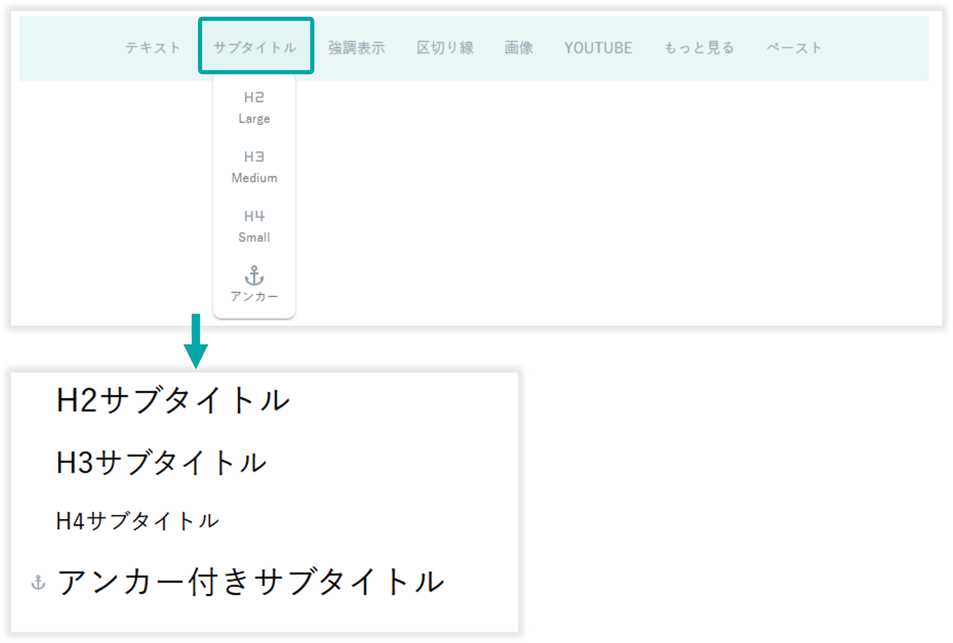 サブタイトルは H2 H3 H4 の3種類のサイズを選択できアンカーを付けることもできます。