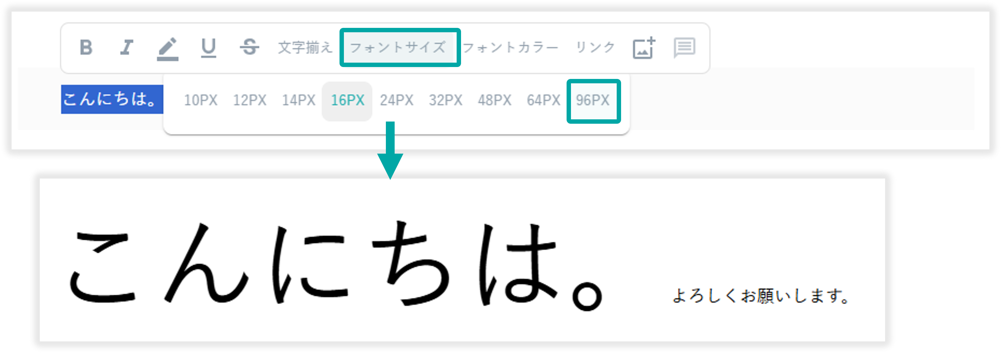 範囲選択したテキストのフォントサイズを変更できます。テキストのデフォルトサイズは16PXです。