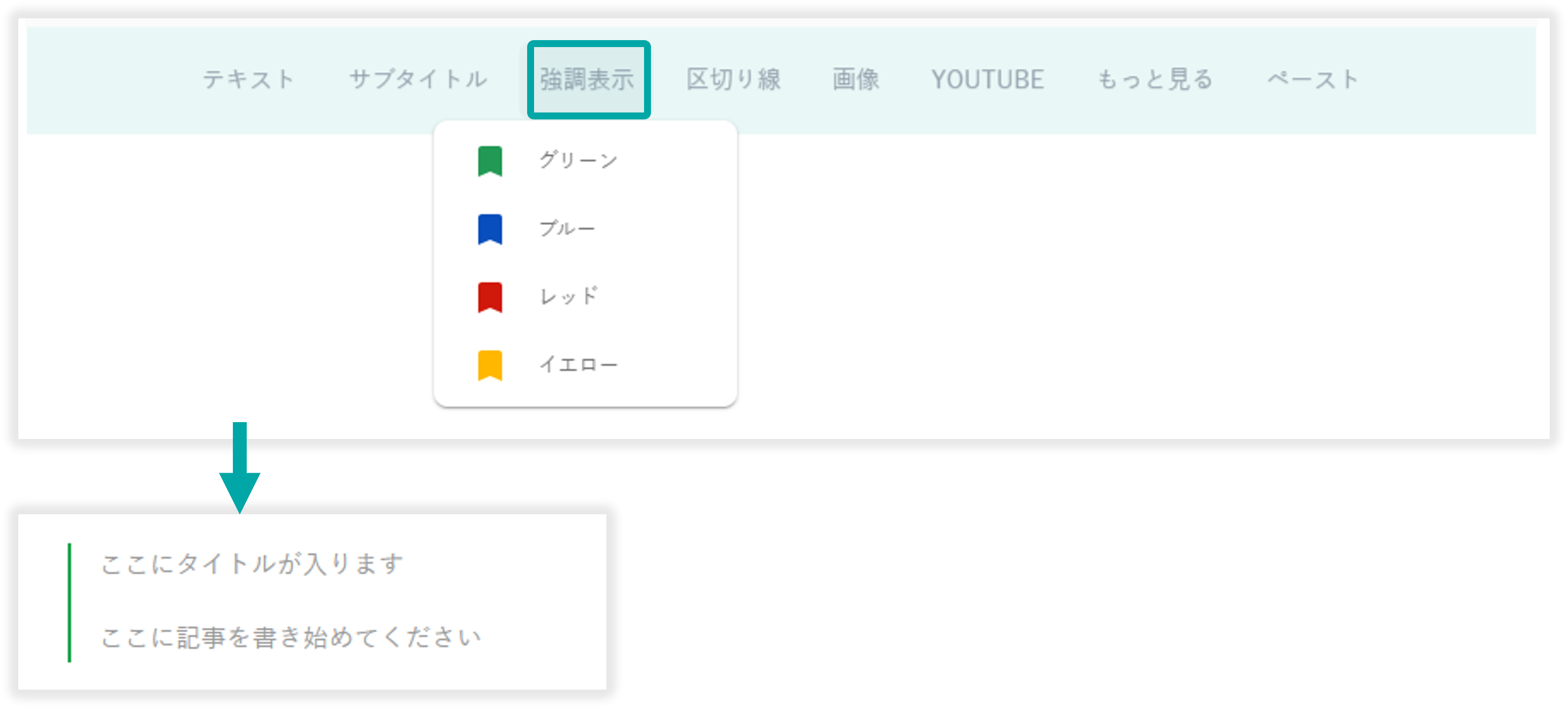 強調表示は「グリーン」「ブルー」「レッド」「イエロー」からカラー選択ができます。