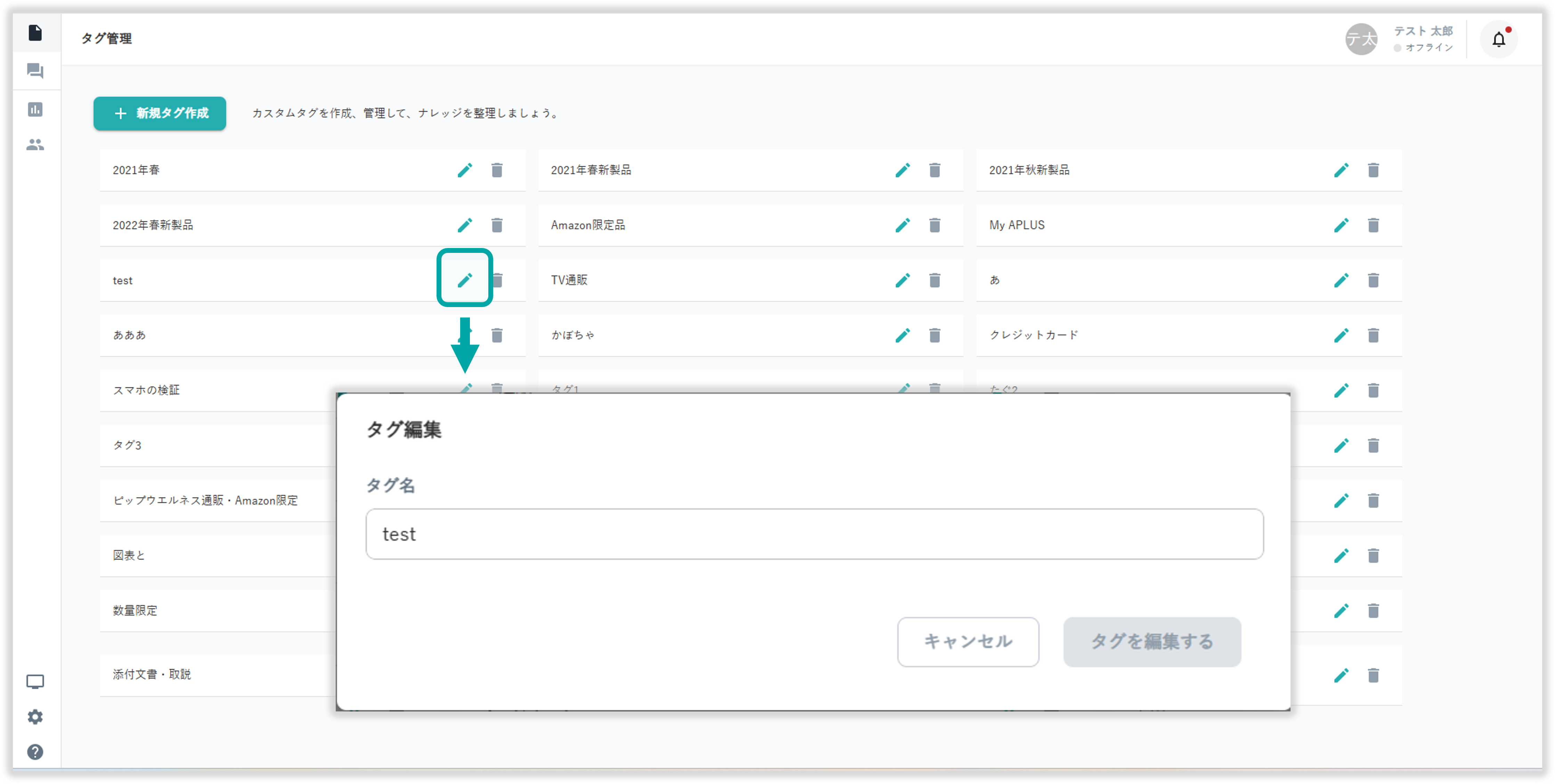 ナレッジタグ管理画面の アイコンを選択してナレッジタグの編集が行えます。