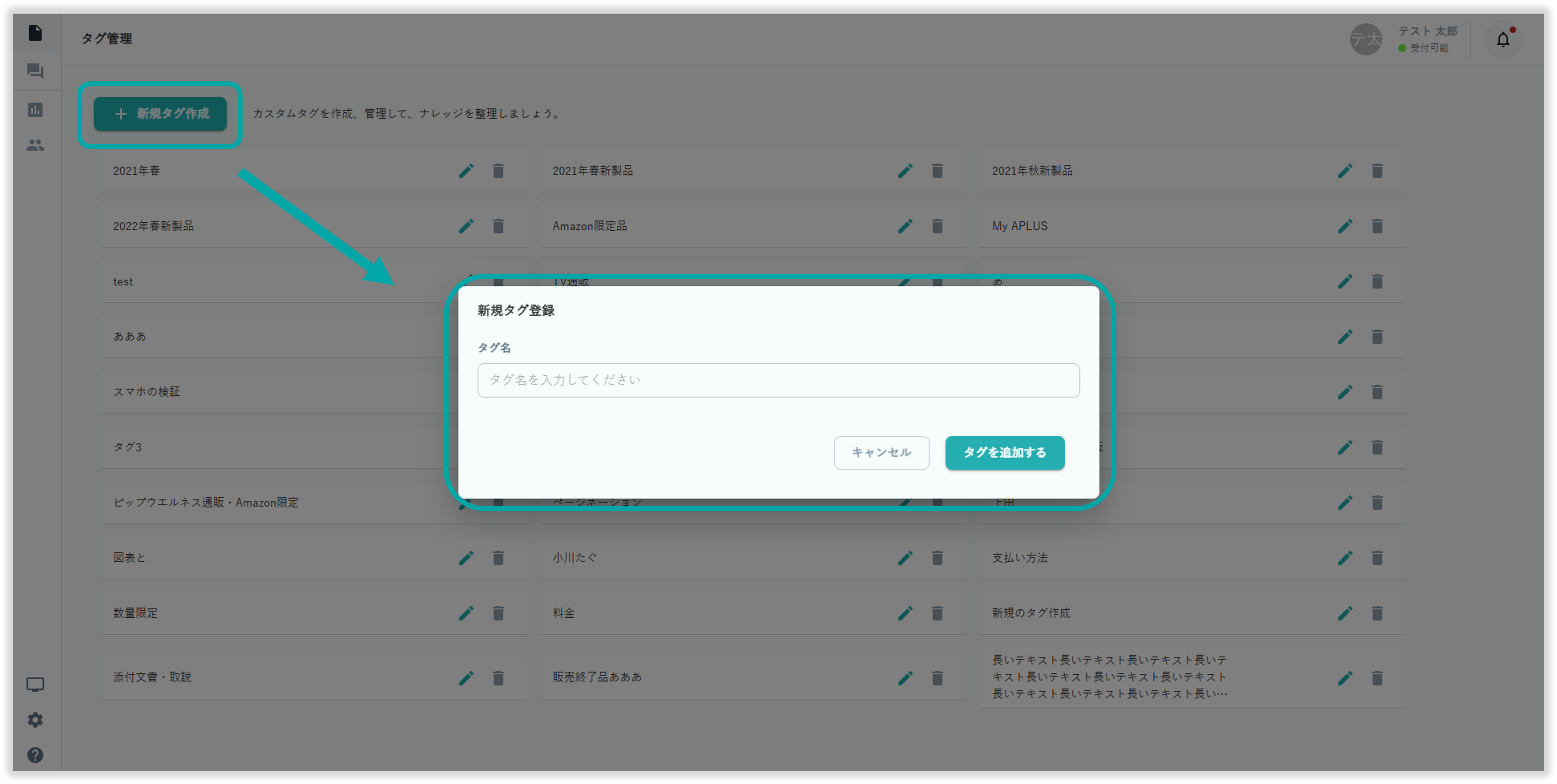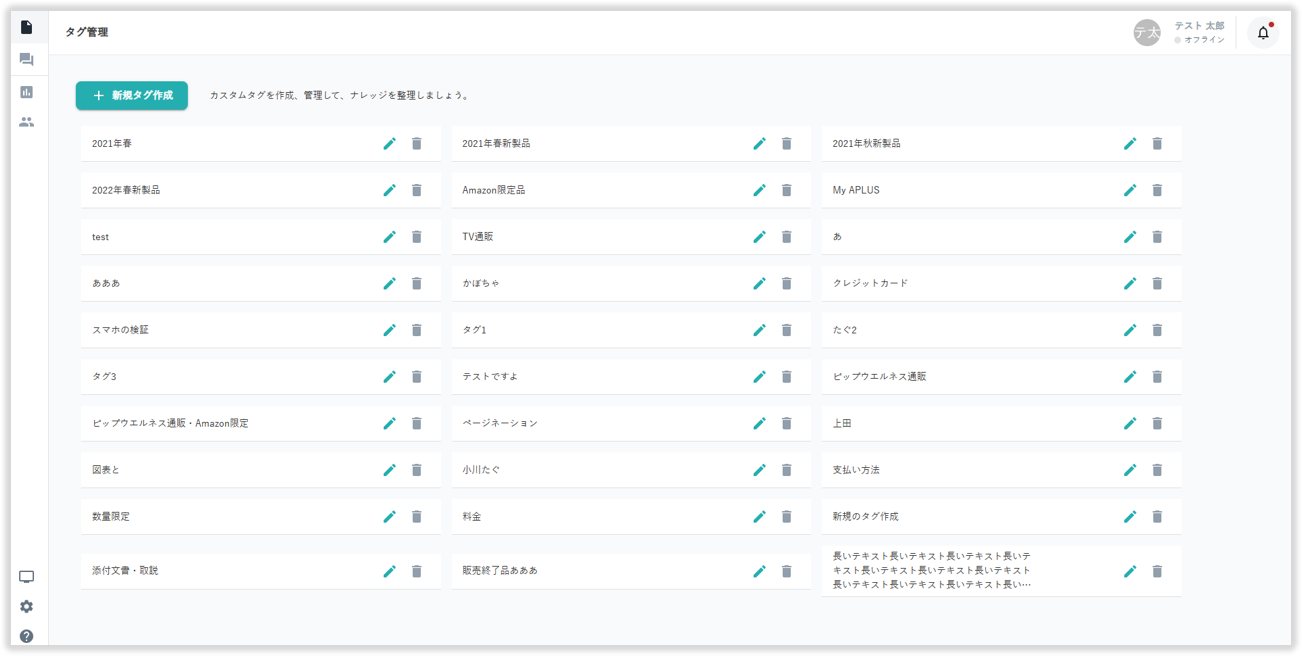 ナレッジタグ管理画面左上の「新規タグ作成」を選択してナレッジタグの新規作成が行えます。