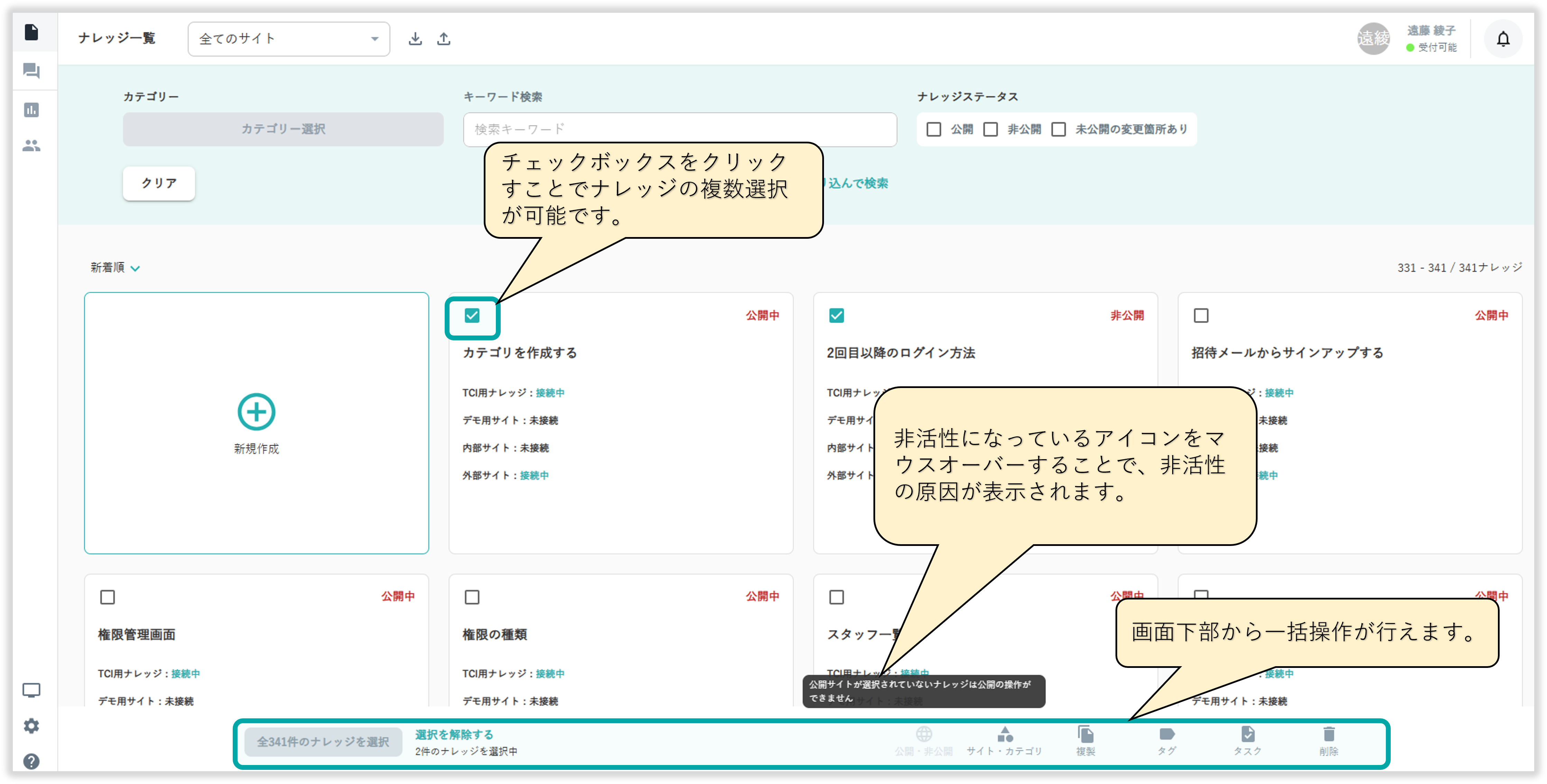 ナレッジを複数選択後、画面下の「サイト・カテゴリ」を選択することで選択したナレッジのサイト、カテゴリーの紐づけ状況をを一括で変更可能です。