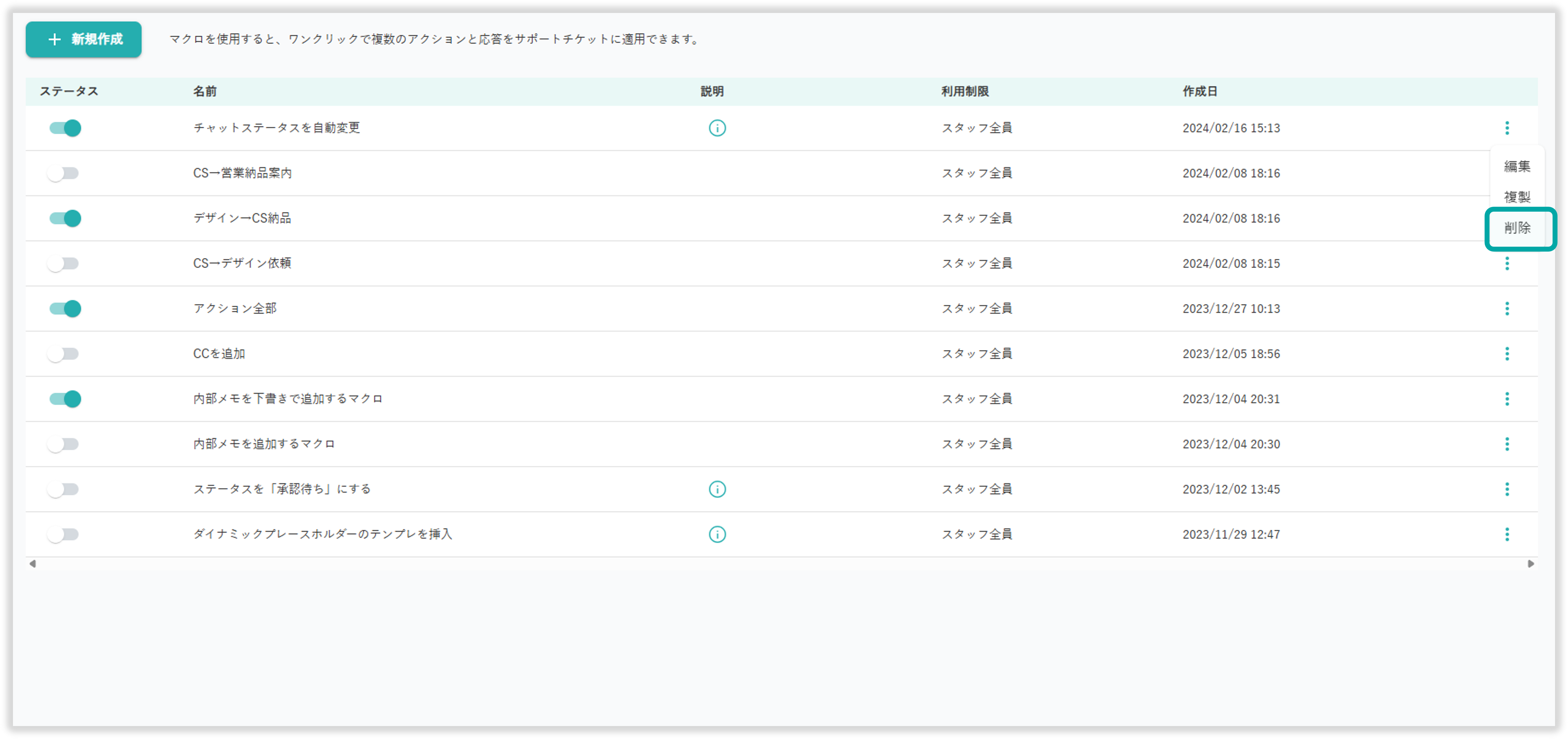設定>チケット設定>マクロ管理 からマクロ管理画面へ遷移できます。本ナレッジではマクロの削除方法をご説明いたします。