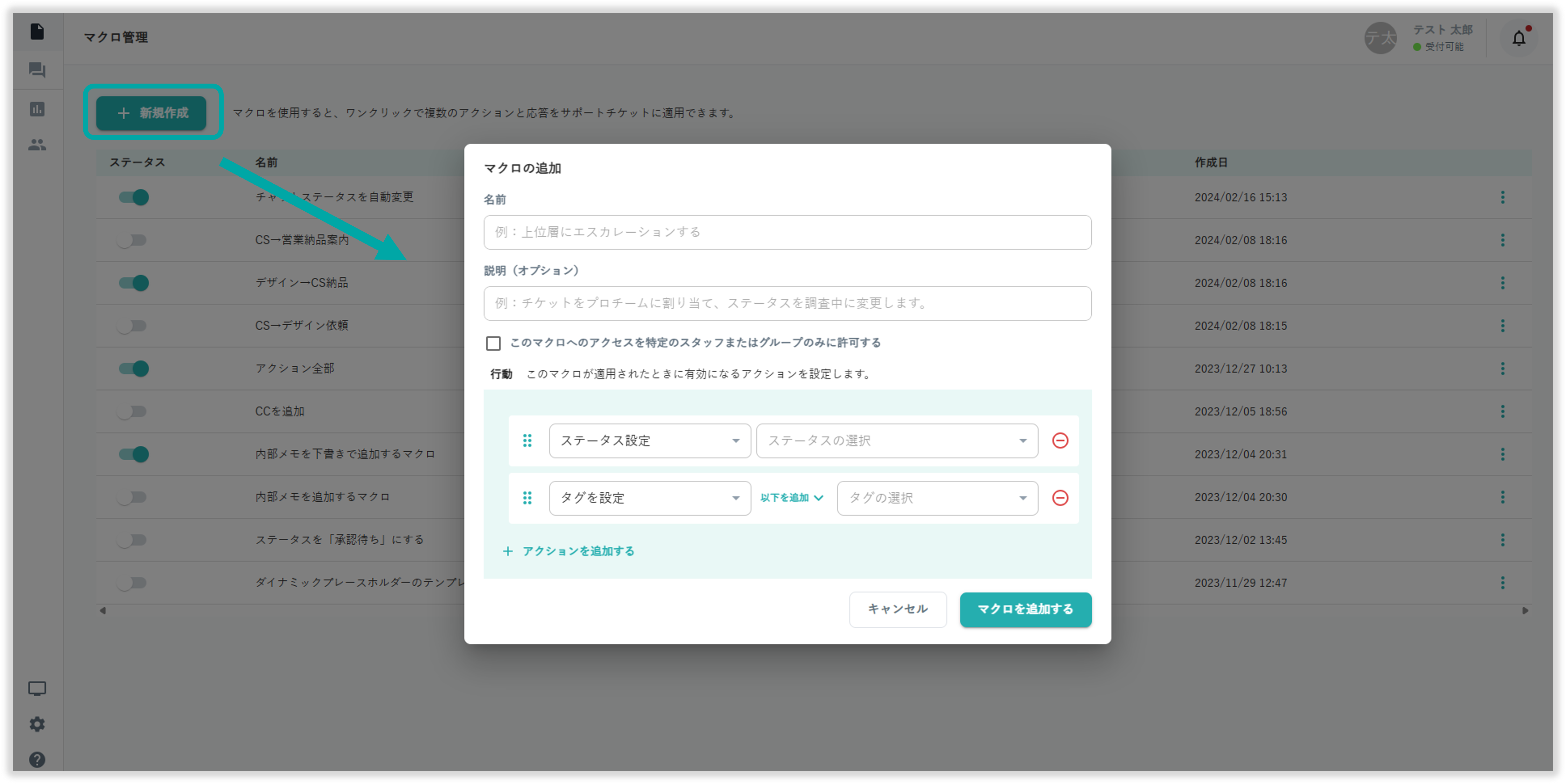 マクロ管理画面の「新規作成」を選択することで、マクロの作成が可能です。