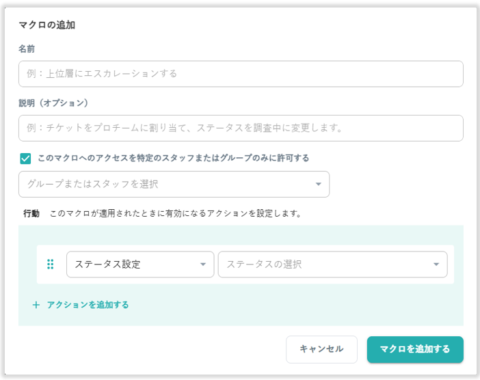 「このマクロへのアクセスを特定のスタッフまたはグループにのみ許可する」にチェックを入れてスタッフまたはグループを選択することで、マクロを利用できるスタッフを制限できます。