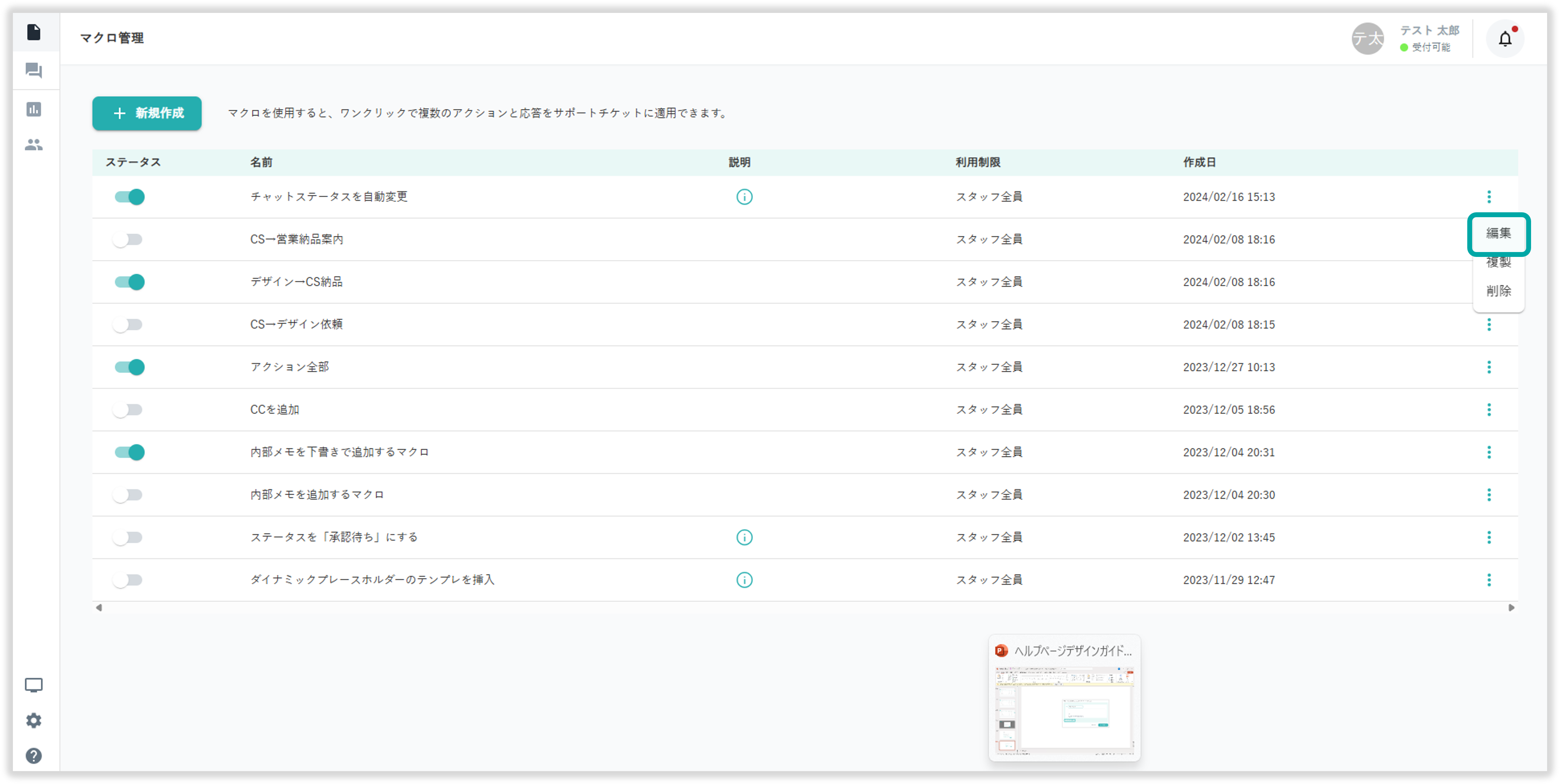 マクロ一覧右側の3点リーダーから「編集」を選択することでマクロ編集画面へ遷移できます。