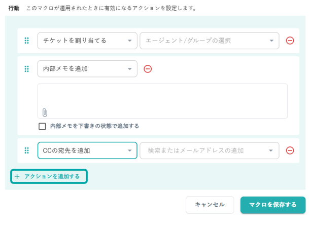 マクロが適用された時に実行されるアクションを設定できます。「アクションを追加する」を選択してアクションの追加ができます。