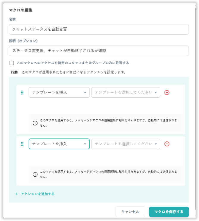 「このマクロへのアクセスを特定のスタッフまたはグループにのみ許可する」にチェックを入れてスタッフまたはグループを選択することで、マクロを利用できるスタッフを制限できます。