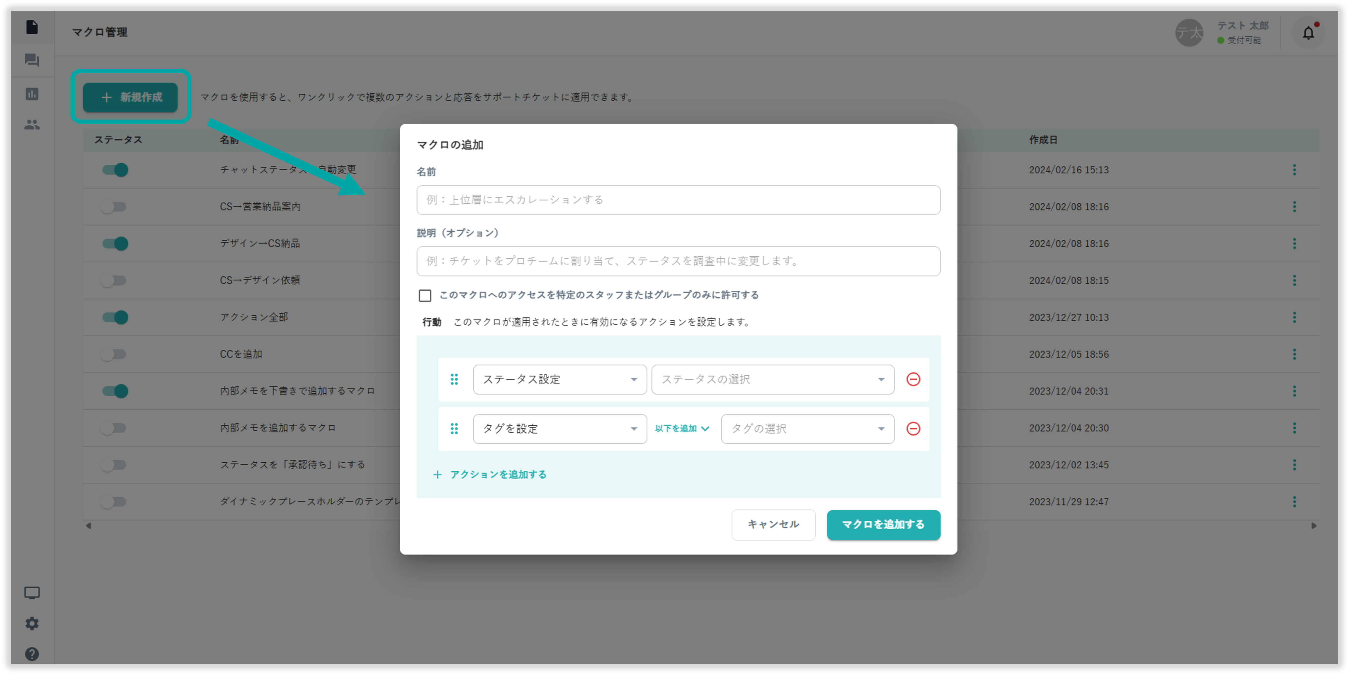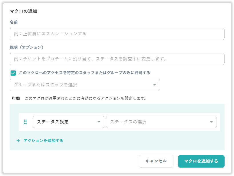 マクロを作成することで、チケットに対する様々なアクションを1ボタンで適用できるようになります。
